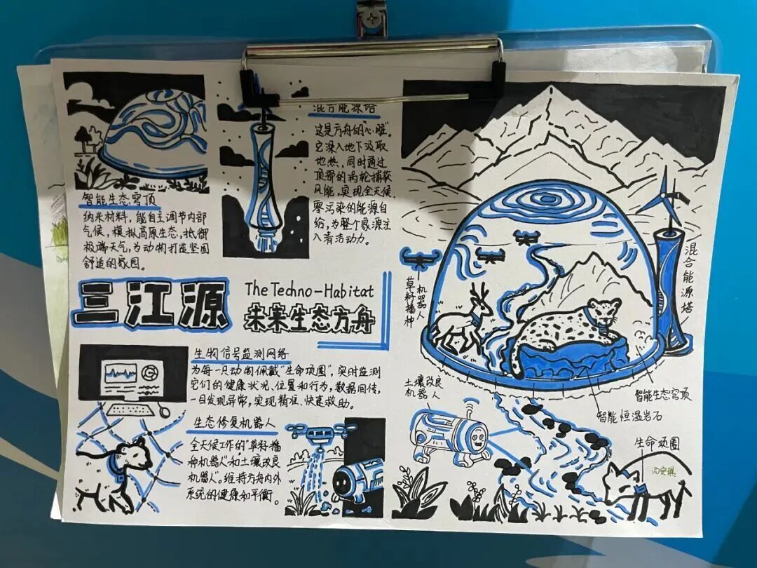 选择“三江源”作为“一平米博物馆”的首个主题,是晶城中学在大思政课育人新生态背景下探索项目化学习的绝佳载体。在“一起画下我们的三江源”展区,这里有满载逻辑思维的三江源生态调查报告、生物多样性主题绘画作品以及融合科技创意的作品,一幅幅作品直观展示同学们跨学科学习成果,正是这堂“行走的思政课”最真实的写照。
