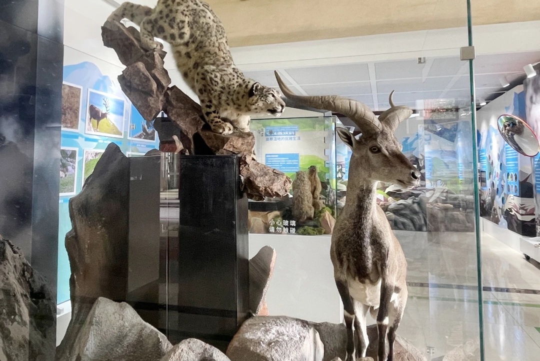 走进晶城中学厚朴楼的西门,“一平米博物馆”内蓝色的展板与岩石模型巧妙结合,共同构成了高原的生态环境。最吸睛的是那只3.1米高、呈捕猎状态的雪豹标本,现场还有岩羊、藏狐、黑颈鹤、喜马拉雅旱獭共5件标本与1件标本模型。晶城中学仅用“一平米空间”,巧妙还原三江源地区核心自然生态景观。