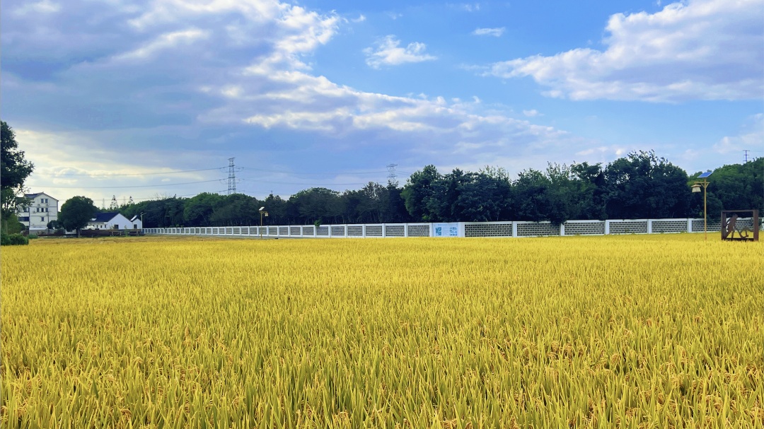 从回龙支一路出发,便踏入了本次徒步的第一站——回龙村。作为上海市乡村振兴示范村和美丽乡村示范村,这里的景致满是江南农家的惬意,路两旁的稻田正泛着金黄,沉甸甸的稻穗在风里轻轻摇曳,勾勒出最质朴的田园画卷。
