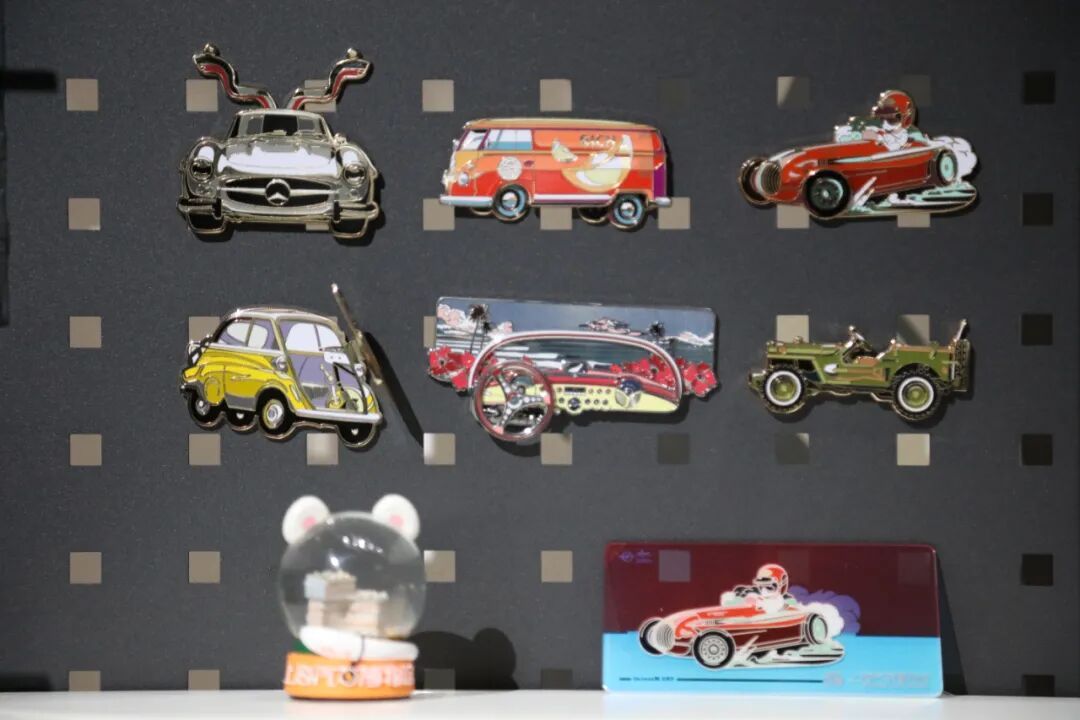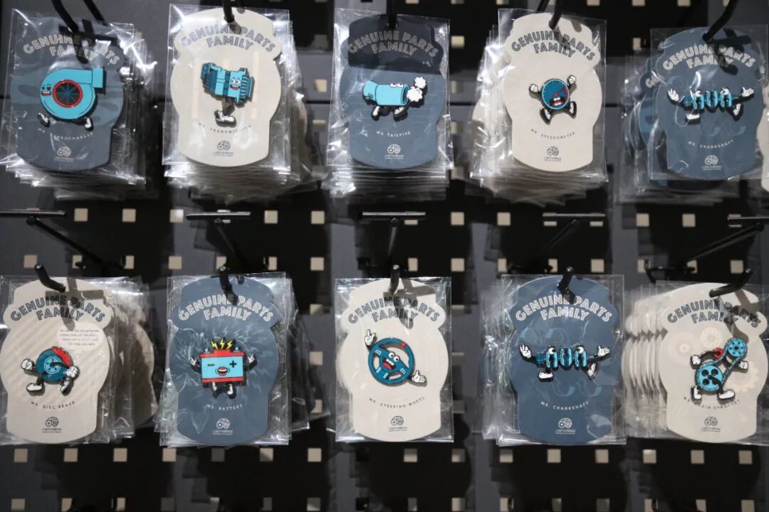 在三楼技术馆的纪念品商店,“汽车原装配件家族系列”徽章依次陈列。与常见整车造型文创不同,这套徽章将车辆“解剖”为12个独立零件,活塞、刹车、方向盘等被赋予鲜明人设。