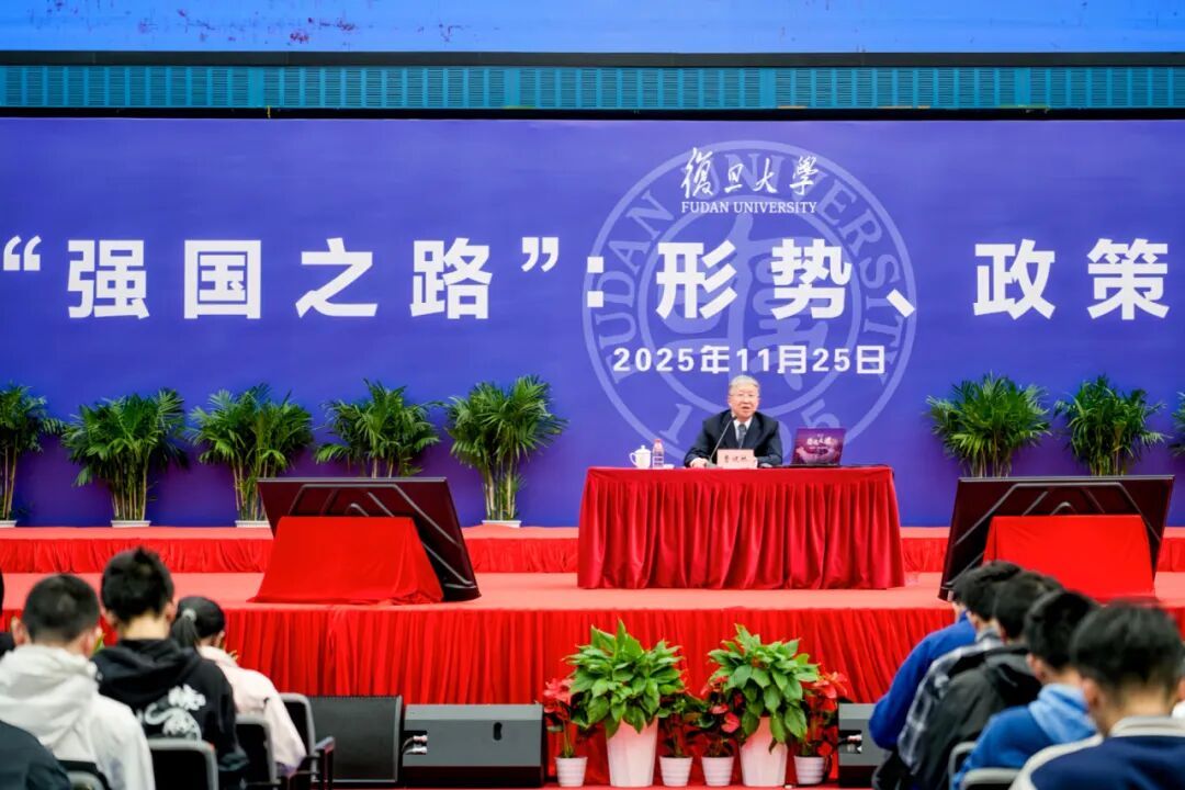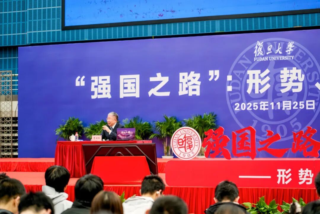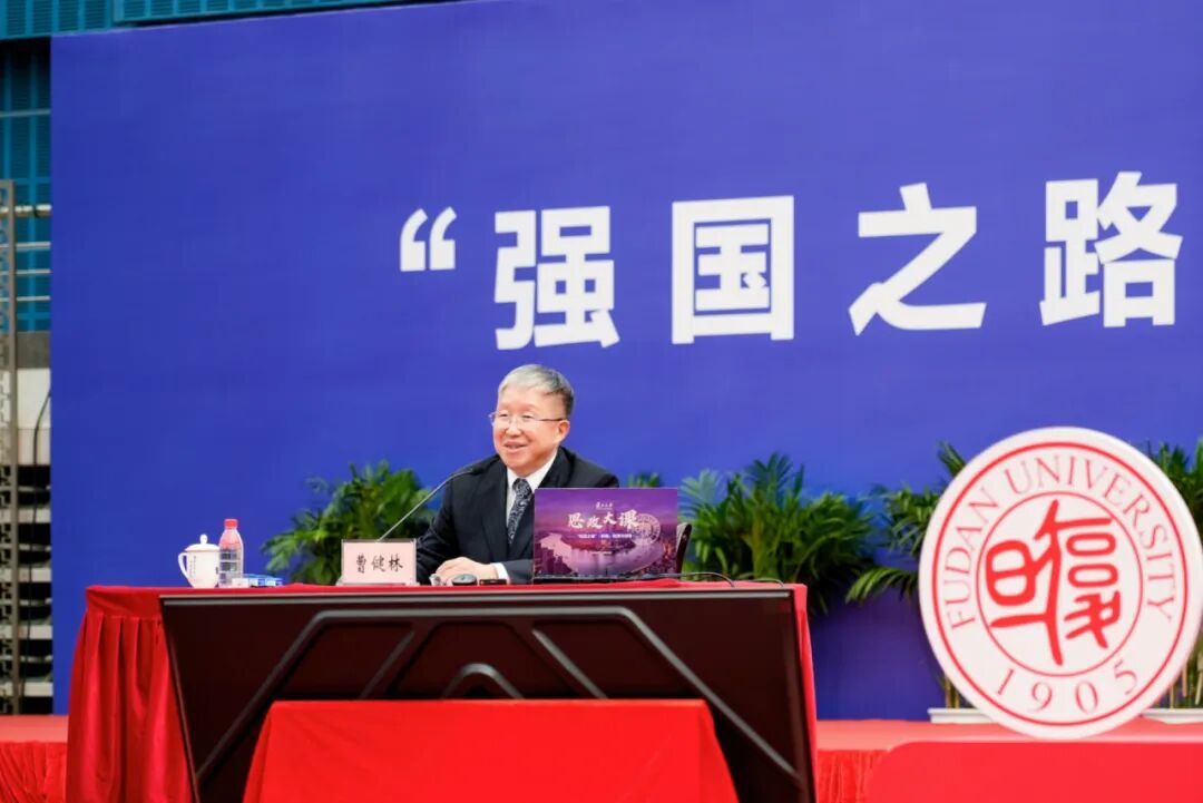 一段简单的开场白后,本学期“强国之路”思政大课迎来收官之讲。“我要讲的题目,叫《从‘不挨打、吃饱饭’到‘富起来、强起来’——结合个人经历的中国科技发展道路之回顾与展望》……”曹健林的话音落下,一段中国跨越式的科技发展历程便在新生面前徐徐展开。作为亲历者与见证人,他的讲述让这段历史变得具体而真切。复旦大学党委副书记钱海红和相关单位负责人出席。