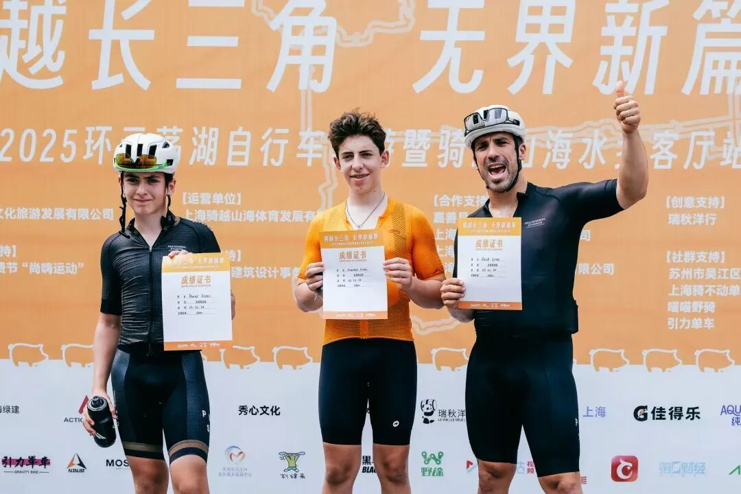 安大卫还教孩子们公路自行车赛中的各种战术,孩子们颇感兴趣。在今年9月举行的“骑越长三角,无界新篇章”2025环元荡湖自行车骑游暨骑越山海水乡客厅站活动中,父子三人同时登上挑战组冠亚季军领奖台的场景,羡煞众人。
