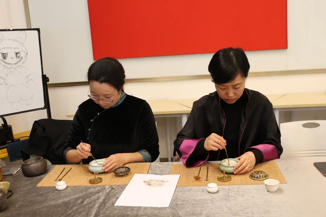 在巧手打篆香环节,参与者们跟随拾艺汇相关负责人用香铲理平香灰,置上篆模,并填上香粉。当篆模被提起,一个精美的莲花或福字图案便呈现于香炉之中。引燃后,一缕青烟顺着香篆的纹路缓缓升起,满室生香,沁人心脾。