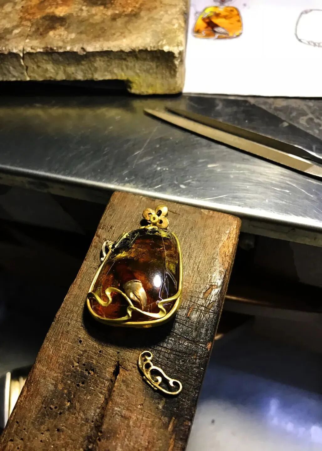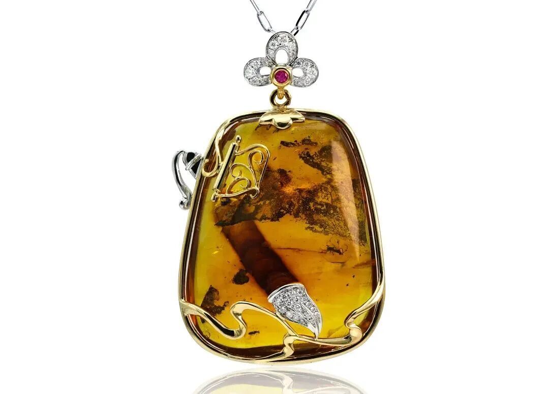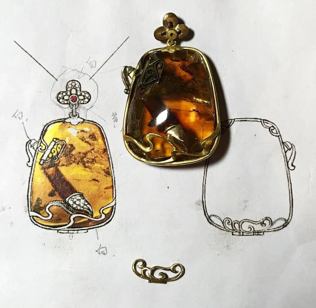 在多年的精心打磨中,吴雨芳逐渐形成了清晰的创作路径。在“黄浦区劳模创新工作室”——陆莲莲大师工作室,她潜心钻研高级定制,每一件作品都倾注心血,将客户的独特故事化作永恒的艺术品。那些镶嵌着宝石的定制首饰,不仅是贵重物品,更是承载着精神内涵与情感个性的传家之宝。其中,有一件匠心独具的代表作《妙笔生辉》琥珀挂坠,吴雨芳以一块浑然天成、内部形似笔杆的琥珀原石为材料,捕捉其内部如山水幻境的天然流纹,缀饰祥云纹镶扣与璀璨宝石,将“神笔马良”的浪漫幻想凝练于方寸之间。