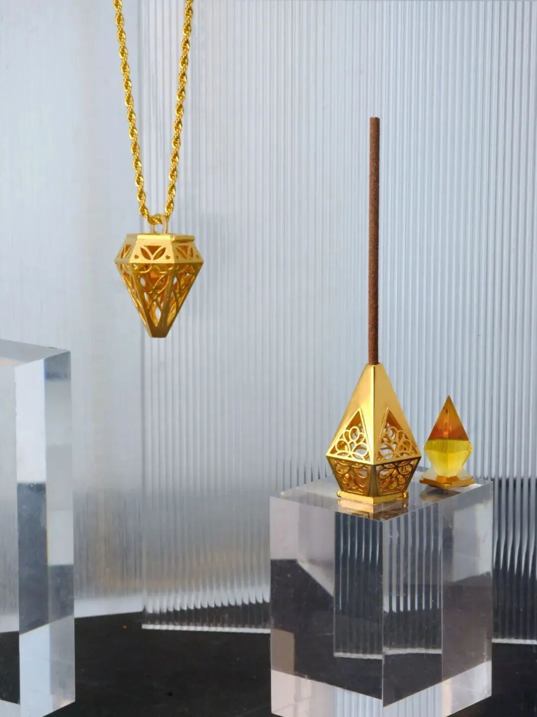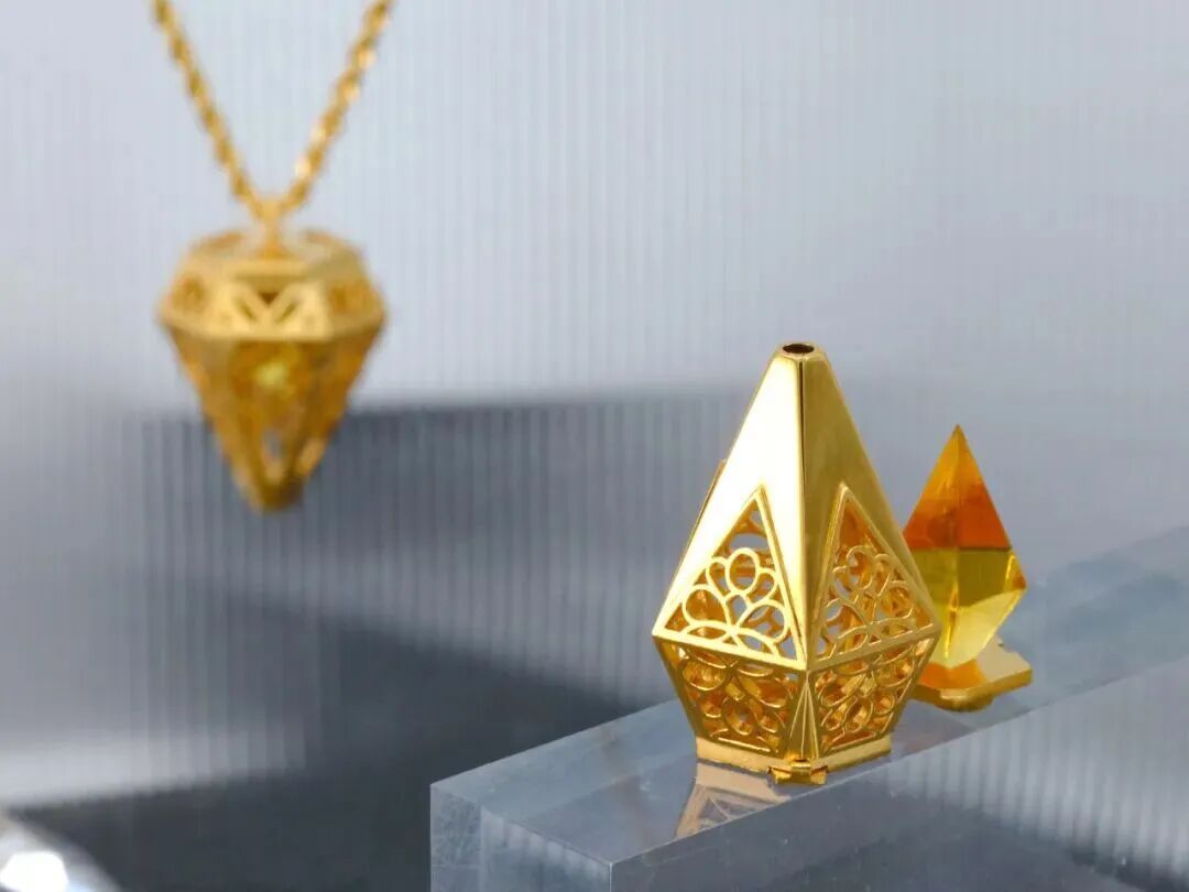 《光耀之境》香插则展现了吴雨芳对传统与现代融合的独到见解。她打破香器固有的古典形态,从现代珠宝中汲取灵感,创造出既可佩戴又可作为艺术摆件的作品。最巧妙的是可拆卸的金珀设计,金珀作为核心器物通透莹润,既是捕捉光线的艺术灵魂,亦可作为独立把玩的雅物,让光影、香气与佩戴者产生美妙的互动。这件荣获“申香杯”香饰设计大赛特等奖的作品,完美诠释了她“让传统美学融入现代生活”的设计追求。