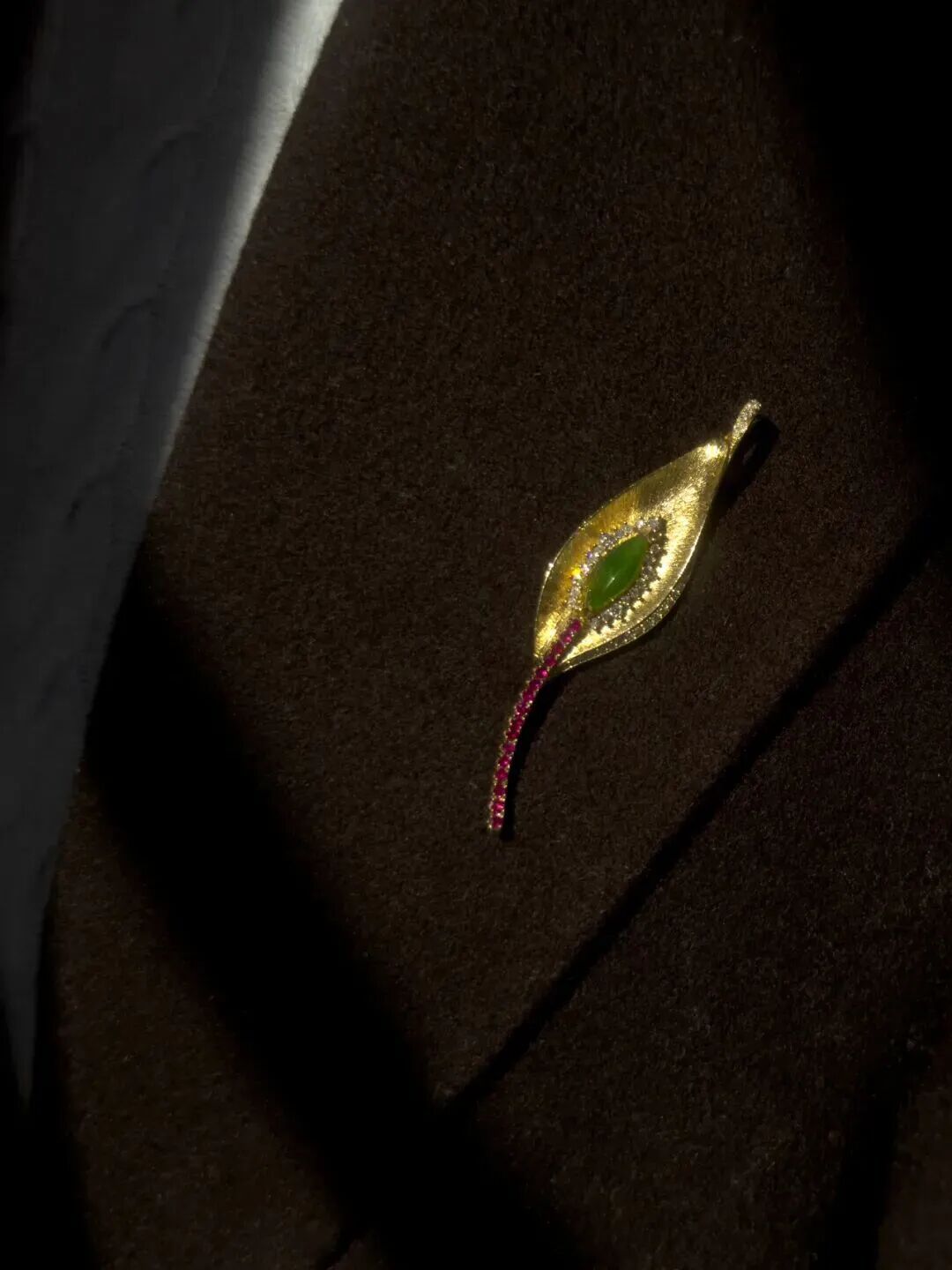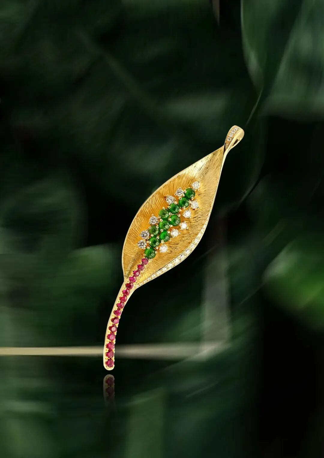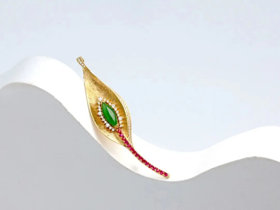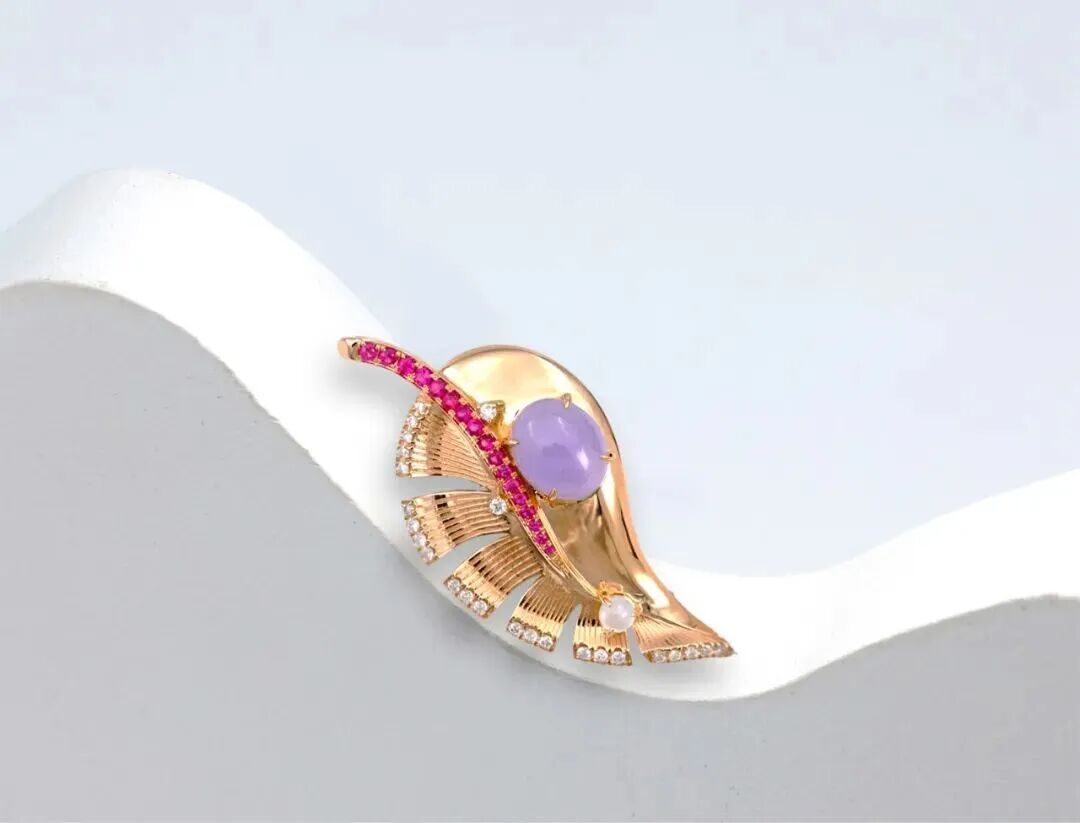 在《呼·吸》胸针中,吴雨芳尝试用珠宝语言诠释生命的律动。红宝石镶嵌的脉络,仿佛血液和养分,象征着生命的奔流不息;翡翠与璀璨钻石在中心交汇,隐喻光合作用,产生巨大能量的反应炉。金属拉丝工艺打造的叶脉纹理,仿佛正在舒展生长,使金属拥有了柔软的生命感;这件作品不仅获得了上海钻石行业协会珠宝首饰产品设计竞赛个人银奖,更拓宽了珠宝作为“可穿戴艺术”的边界,也挖掘了高级定制珠宝在艺术表达与深层文化叙事上的无限可能。