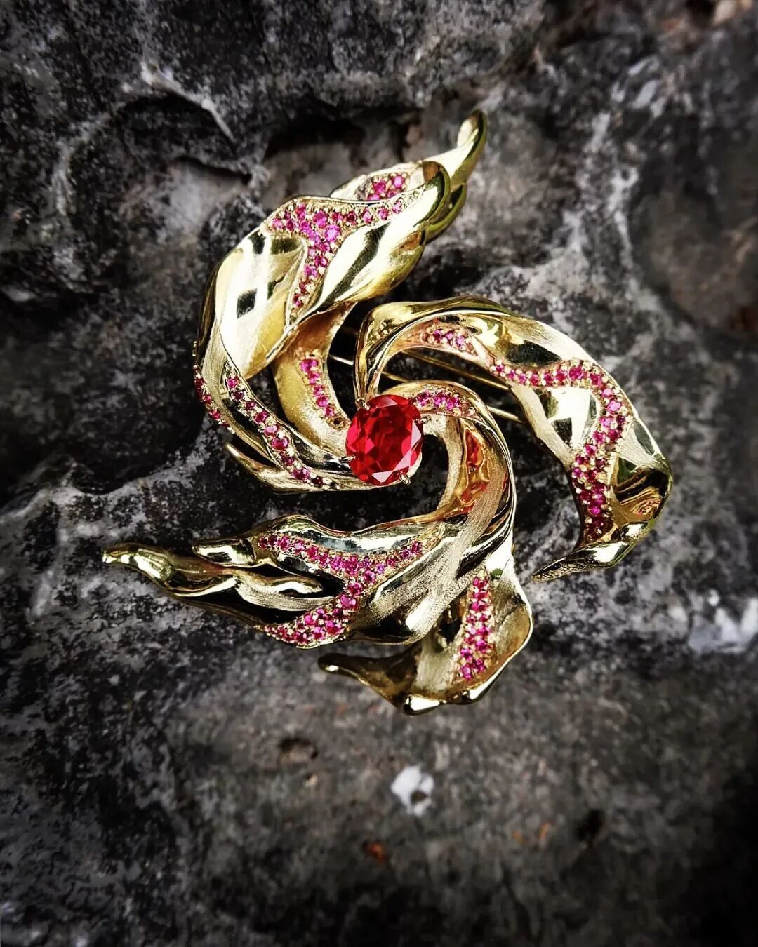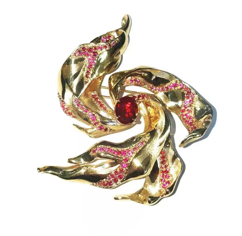 《白日焰火》胸针是吴雨芳入行之初的代表作品,曾获“2017年上海新锐首饰设计大赛”优秀作品并入选“中日青年首饰设计东京交流展”赴日本展出。这件作品源于她对童年记忆的诗意表达。为了捕捉昼日烟花的瞬间绚烂,她反复推敲火焰每一处跃动的弧度,通过手工蜡雕工艺将动态的美感凝固成永恒。中央镶嵌炽热红色宝石作为视觉焦点,运用多种金属表面肌理,精密排列的辅石强化了火焰的质感与光芒,最终在方寸间生动再现了烟花璀璨绽放的视觉效果。当这件作品入选国际交流展时,她更加坚信:真正打动人心的设计,源于真实的情感。