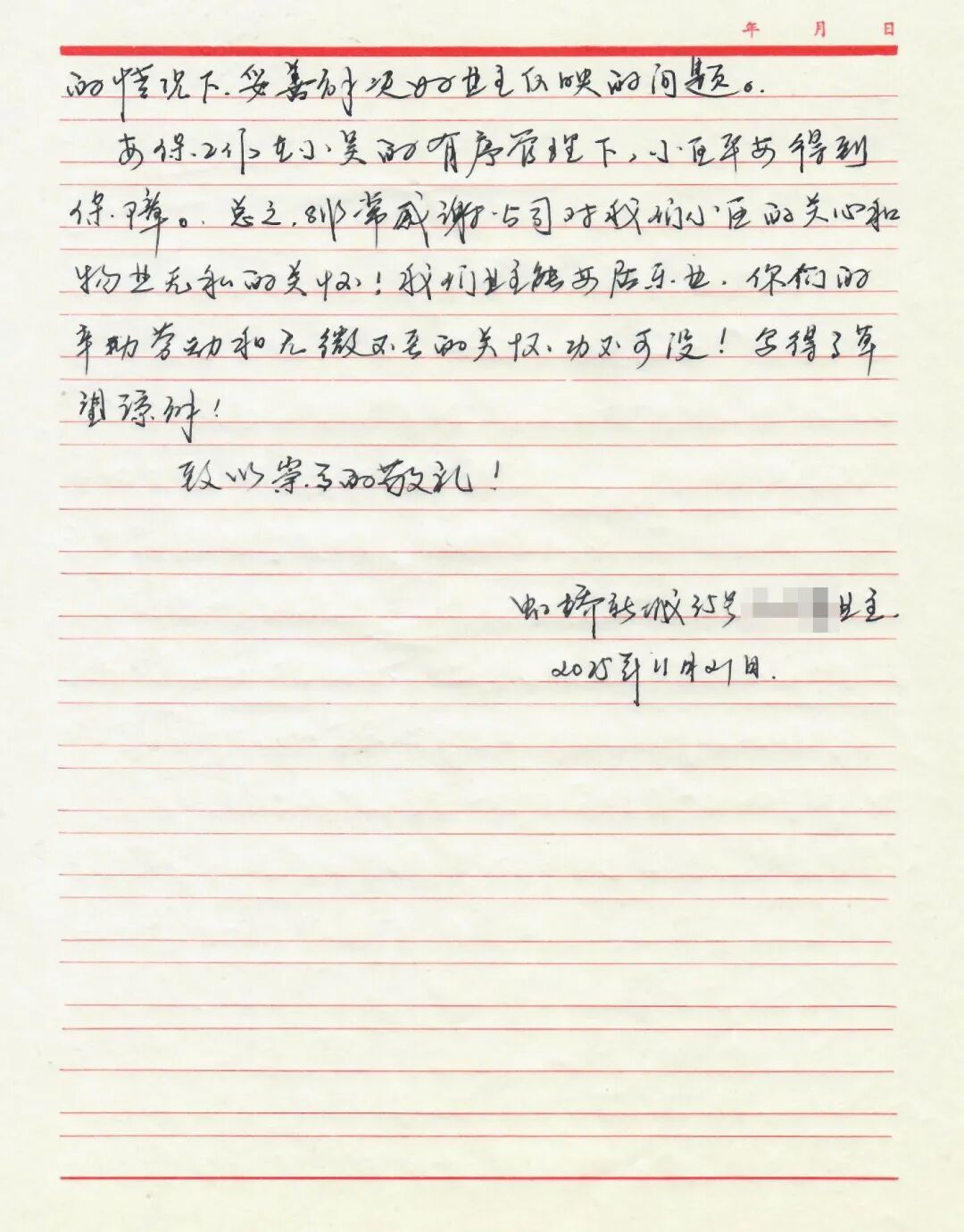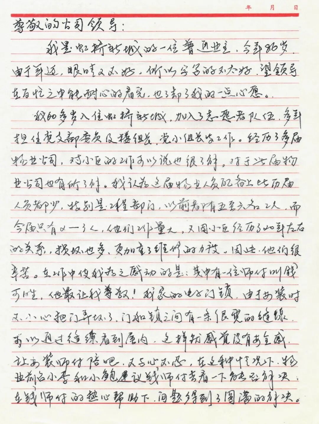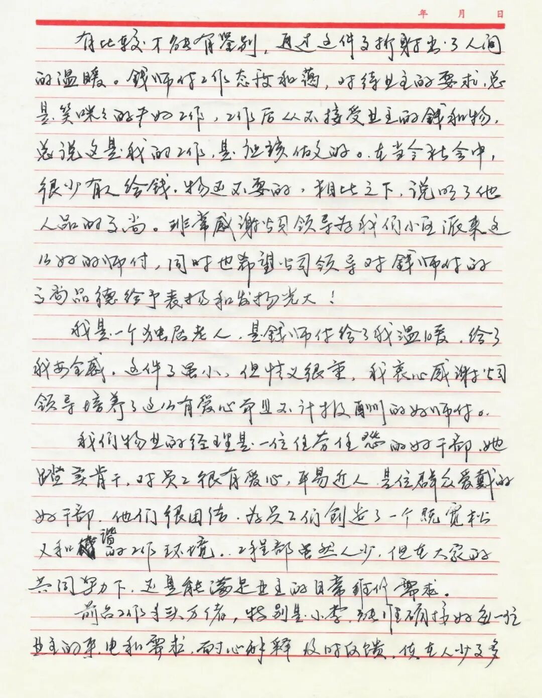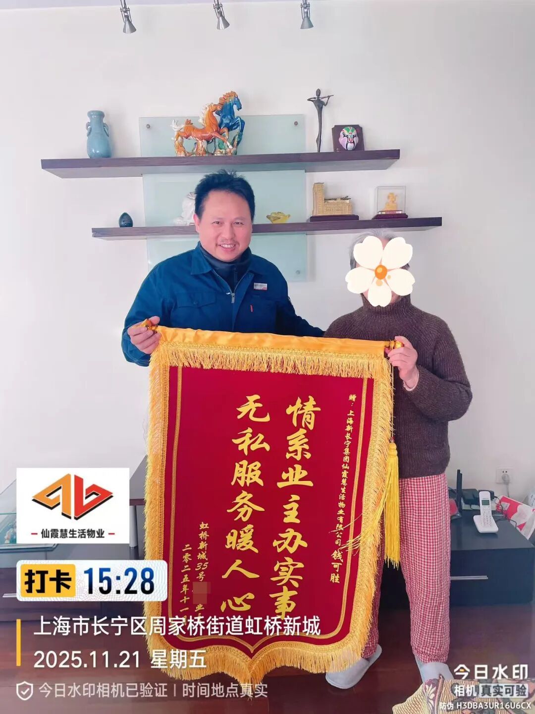 暖心维修解民忧 为老服务获点赞 近日,仙霞慧生活物业收到一位居民送上的一面锦旗和一封感谢信。居民在信中对虹桥新城管理处和维修人员钱可胜表达了感谢。 家住虹桥新城的独居老人在家中更换电子锁后,门体出现了轻微松动和缝隙,不仅影响了正常的开关,更存在一定安全隐患。 对此,虹桥新城物业管理处的维修人员钱可胜在接到报修后,第一时间来到老人家中排查原因,凭借自身专业技术耐心地对门体进行调试,并修补了裂缝,及时消除了门缝安全隐患。尽管老人满心感激地想要支付维修费用,但由于老人年事已高且符合红色物业惠民维修(人工费减免)的条件,于是管理处按照相关流程为老人申请了费用减免。老人对此感激万分,于11月21日下午为管理处维修员钱可胜送上了一面印有“情系业主办实事 无私服务暖人心”的锦旗和感谢信。 虹桥新城物业管理处与钱可胜急业主所急和专业贴心服务的精神,不仅为老人送去了温暖和安全感,也彰显了红色物业的责任担当,赢得了小区业主居民的广泛赞誉。