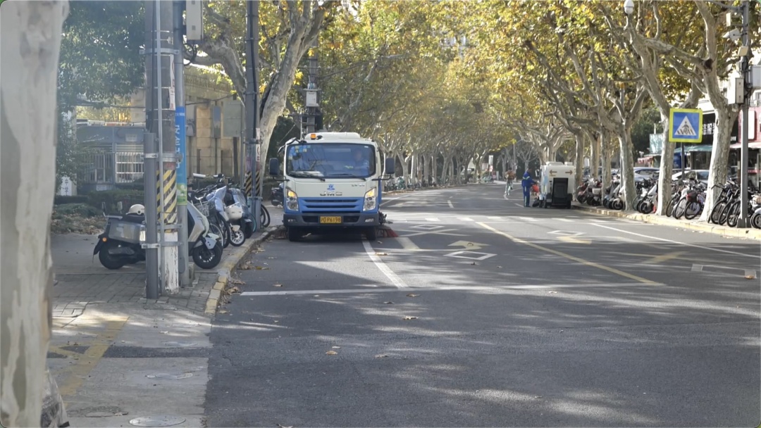 而在金沙路,路面的落叶也明显增加。记者看到,一辆机械化洗扫车沿路缓缓行进,将路面落叶清除。在梧桐密集路段,“人工+机械”协同作业的模式已成为落叶季的常态。