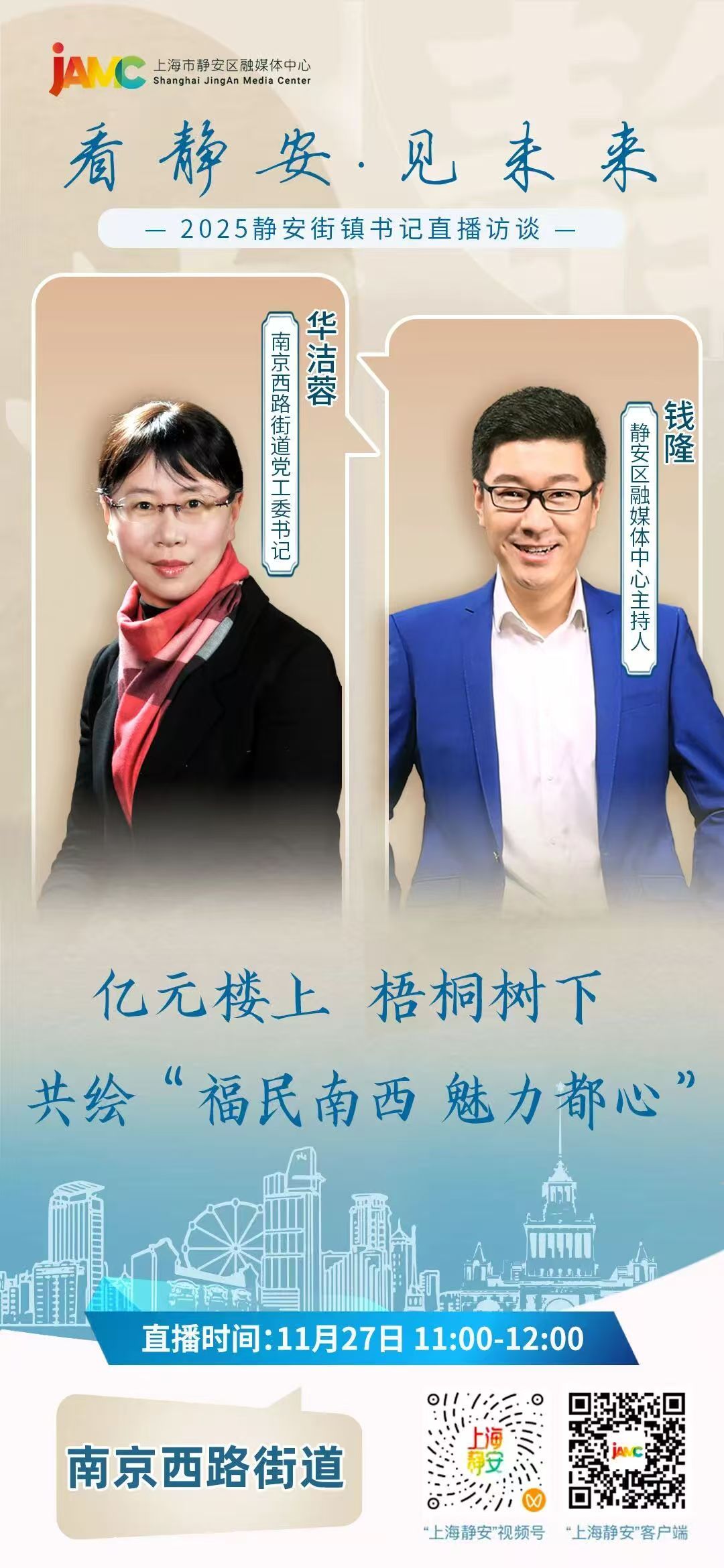 11月27日11:00—12:00,南京西路街道党工委书记华洁蓉 、静安区融媒体中心主持人钱隆 ,与您相约“看静安·见未来” 2025静安街镇书记直播访谈