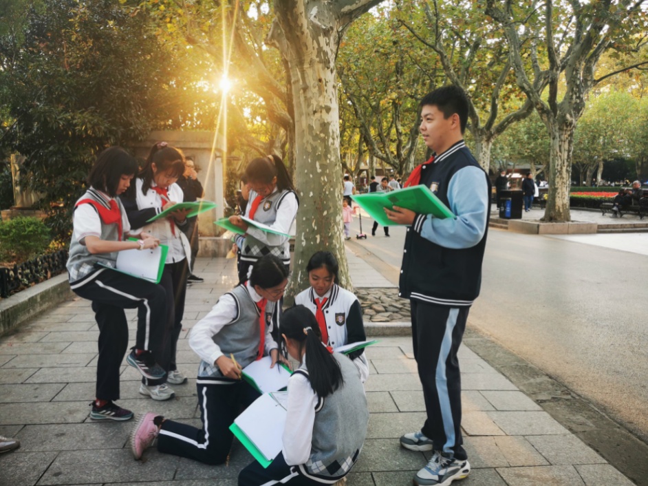 向明初级中学的六年级学生化身“城市探秘者”,在复兴公园实地调研生态环境,运用AI数据分析工具记录生物种类、植被分布等信息,最终,形成一份生态调研报告。