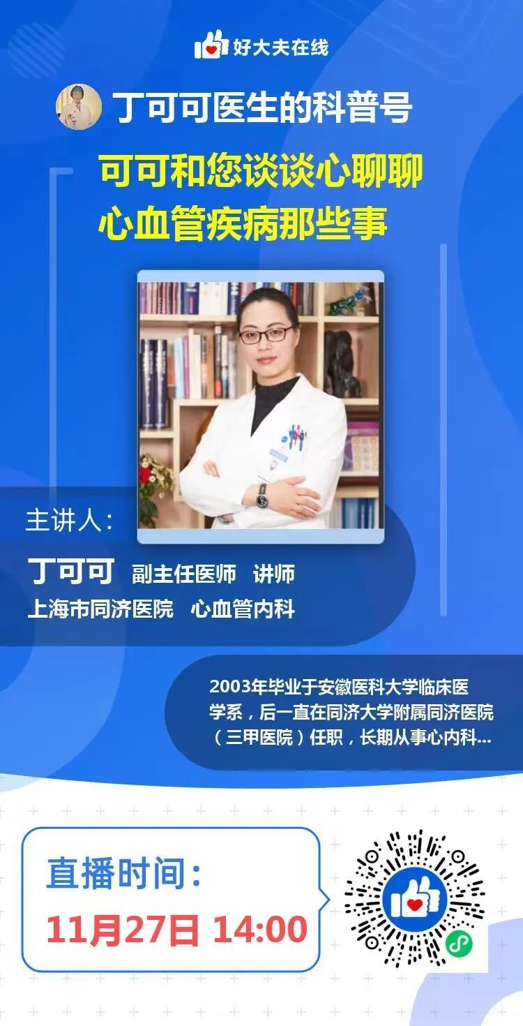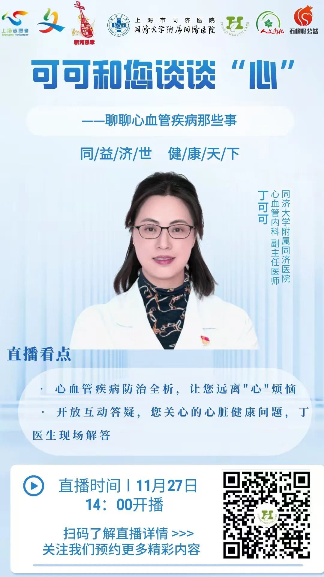 参与方式:扫描海报二维码,关注直播平台预约,11月27日14:00准时开播!把您的心脏健康疑问揣好,直播间等丁医生为您逐一拆解~