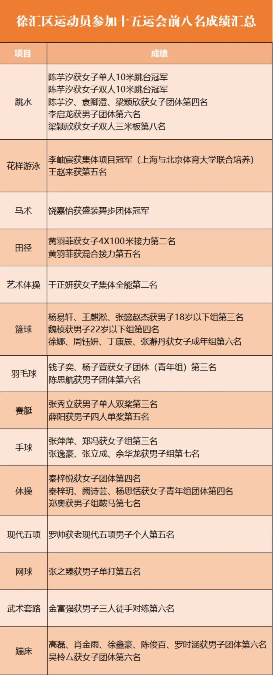 在日前举行的第十五届全国运动会上,来自徐汇区的55名体育健儿,代表上海市出征赛场,顽强拼搏,最终斩获4枚金牌、2枚银牌、4枚铜牌的优异成绩,为上海代表团的荣耀簿添上了浓墨重彩的徐汇篇章。 徐汇力量铸就高光时刻 荣耀的背后,是运动员们日复一日的汗水与坚持。徐汇健儿在多个项目上展现了强大的竞争力。 跳水名将陈芋汐发挥稳定,展现出绝对统治力,成功卫冕女子双人10米跳台和女子单人10米跳台两项冠军,独揽两金。 花样游泳运动员李岫宸在集体项目中表现优异,随队夺得花样游泳集体项目金牌。 马术运动员饶嘉怡在盛装舞步赛场上沉着优雅,助力上海队赢得盛装舞步团体赛冠军。 此外,徐汇运动员在田径、羽毛球、篮球、艺术体操、赛艇等项目上也多点开花,收获奖牌和优异名次,全面展示了徐汇体育的深厚底蕴。 “三驾马车”协同育才结硕果 徐汇健儿的辉煌战绩,源于徐汇区长期坚持的多元化竞技体育人才培养模式。本届全运会的奖牌榜上,清晰地体现了体校、学校、社会机构“三驾马车”协同办训的丰硕成果。 徐汇青训中心(徐汇区青少年体育运动学校)作为传统基石,培养输送了陈芋汐、李岫宸等顶尖运动员。 区域内知名中学提供体教融合的优质土壤,来自上海中学的钱子奕、杨子萱(羽毛球)和来自南洋模范中学的王麒淞、张懿赵杰(篮球)等学生运动员,均在赛场上取得了不俗成绩。 社会力量办训崭露头角,来自徐汇区源长流马术中心的饶嘉怡一举夺金,成为社会体育机构培养高水平运动员的成功典范。 这种“三驾马车”并驾齐驱的培养体系,为有潜力的青少年提供了多元化、高质量的成长路径,共同构筑了徐汇竞技体育人才辈出的坚实平台。 征程不息,荣光续写。第十五届全运会的战果是对过往努力的肯定,更是迈向新高峰的起点。徐汇体育将以此为契机,继续深化人才培养模式改革,夯实后备人才基地,为上海建设全球著名体育城市贡献更多的徐汇智慧和力量。 再次为所有拼搏的徐汇健儿喝彩!