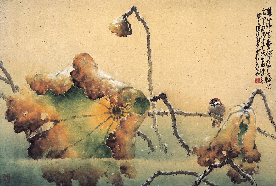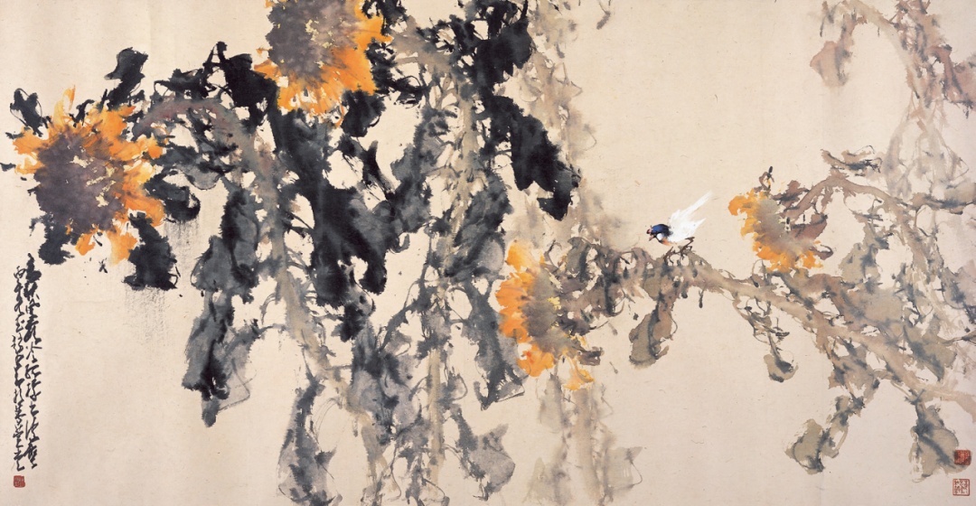《雨余零落不禁秋》体现了赵少昂的典型艺术风格:画面以秋天的向日葵为核心意象,笔墨运用灵动洒脱,既承续岭南画派“折衷中西、融汇古今” 的精神,以水墨浓淡干湿的变化与明丽的设色层次,细腻表现出雨后花叶 “零落不禁秋” 的情态,又通过对花鸟生机的精准捕捉,传递出自然生命的鲜活意趣;作品尺幅阔大却不失灵动雅致,既凝聚了画家数十年的笔墨功力,也彰显出他在花鸟画领域 “雄秀双至、意趣动人” 的作品气质,是其艺术生涯中兼具个人风格与岭南画派精神传承的重要佳作。