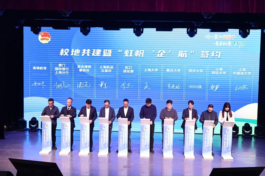 在校地共建暨“虹帆‘企’航”签约启动仪式上,团区委与复旦大学团委、同济大学团委、上海财经大学团委、上海外国语大学团委、上海大学团委,以及上海航运交易所、厦门国际银行上海分行、上海高顿教育科技有限公司、上海至合律师事务所进行签约,进一步推动校企地在思政教育、就业创业、社区治理、社会实践、志愿服务等方面深化合作。新一批百个高校学生企业实习岗位正式发布。