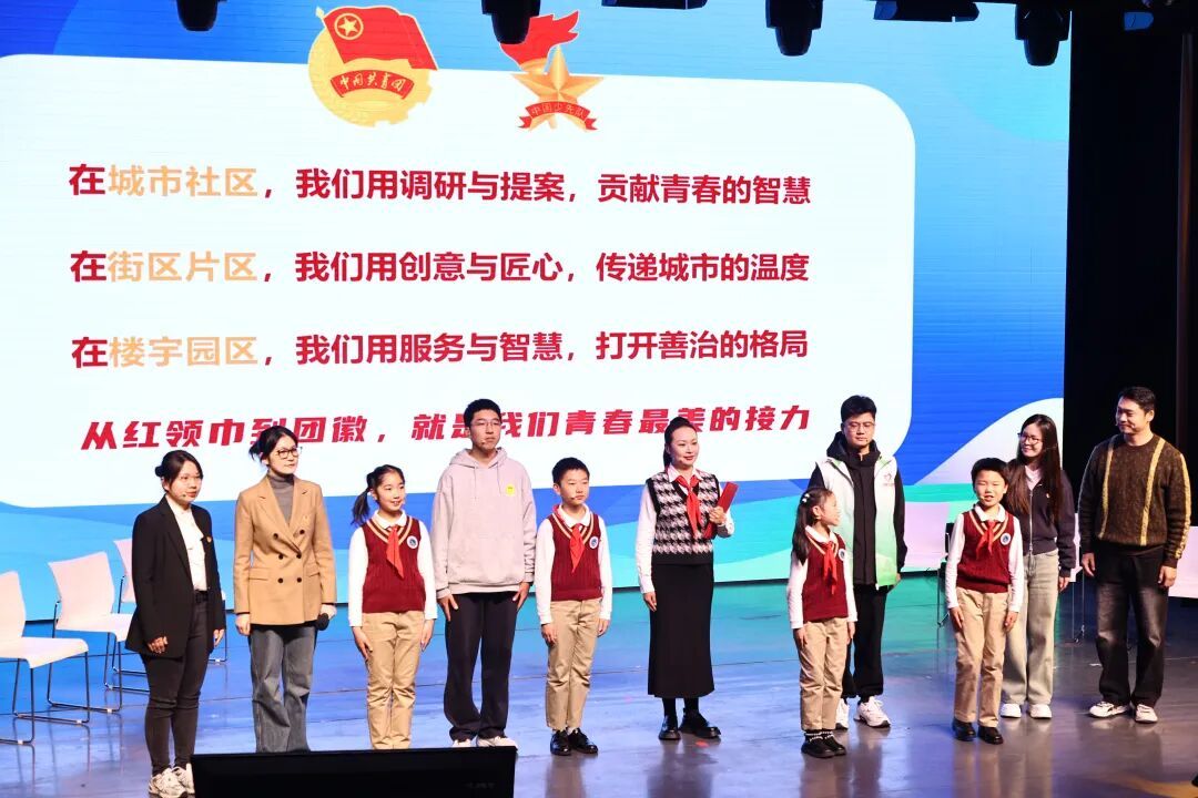 善治共治,青年参与。情景演绎《共筑青春善治成长链》以第四中心小学少先队社会化实践探索为线,通过对话华师大一附中、华东理工大学、曲阳路街道、北外滩街道的青年代表们,展示了党建引领青年参与基层治理、网格化片区、楼宇治理的工作成果与感悟。