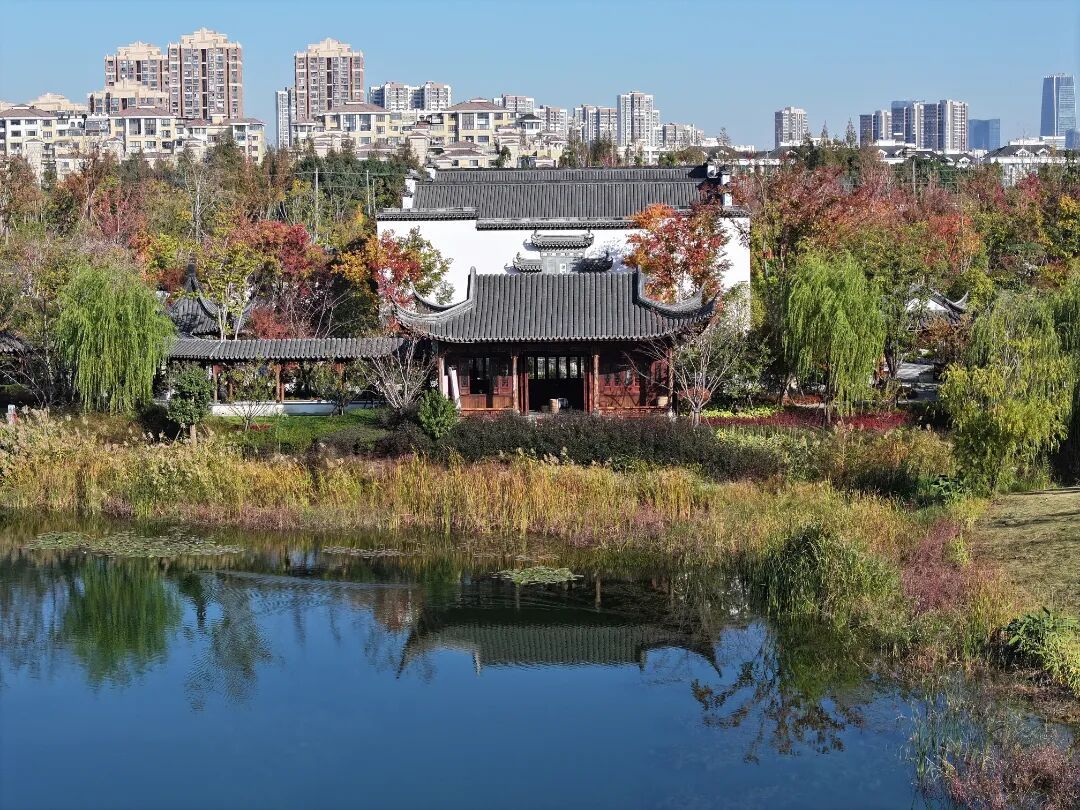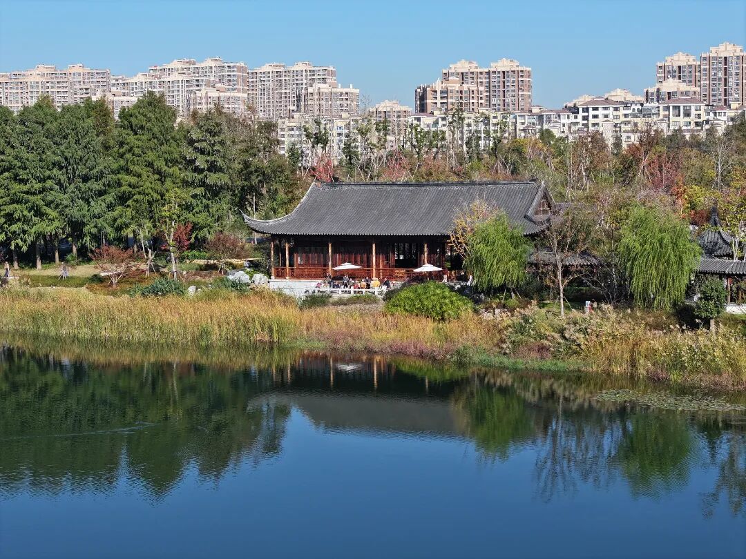穿过曲折幽深的回廊,在湖边有一座湖心亭,视野开阔。坐在亭子里,看对面公园的景色倒映在粼粼波光中,有种避开喧嚣的隐居感,点上一杯香茗,感受风拂芦苇的诗意,正可谓“江南水波映天光,风抚芦苇见茶香”。