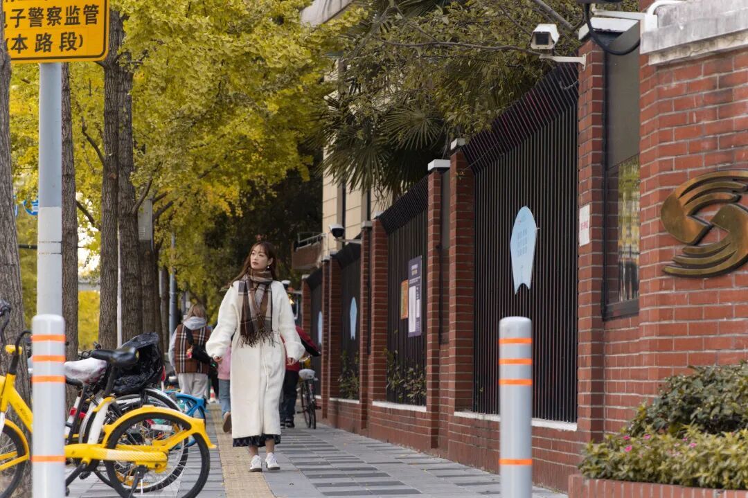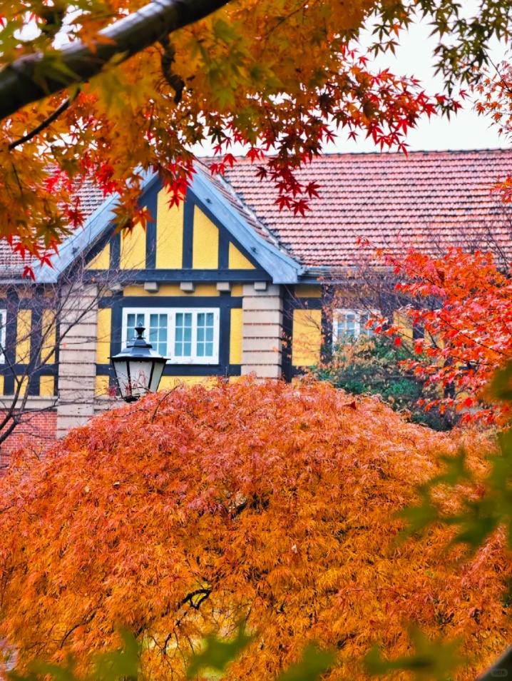 百年建筑与金色梧桐交织成曲,老房的屋顶在层叠秋叶间若隐若现。初冬午后的阳光洒落于红砖之上,光影流淌,温暖中漫溢着旧日的浪漫。