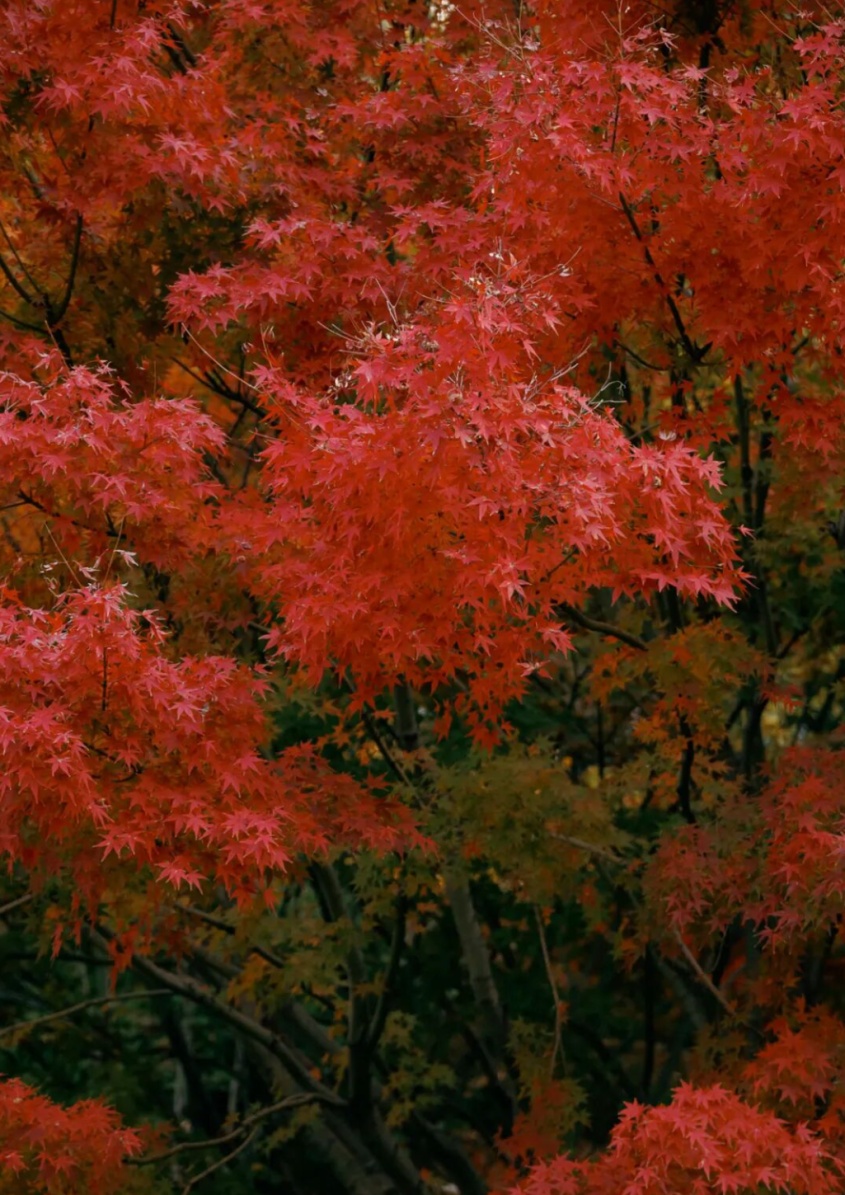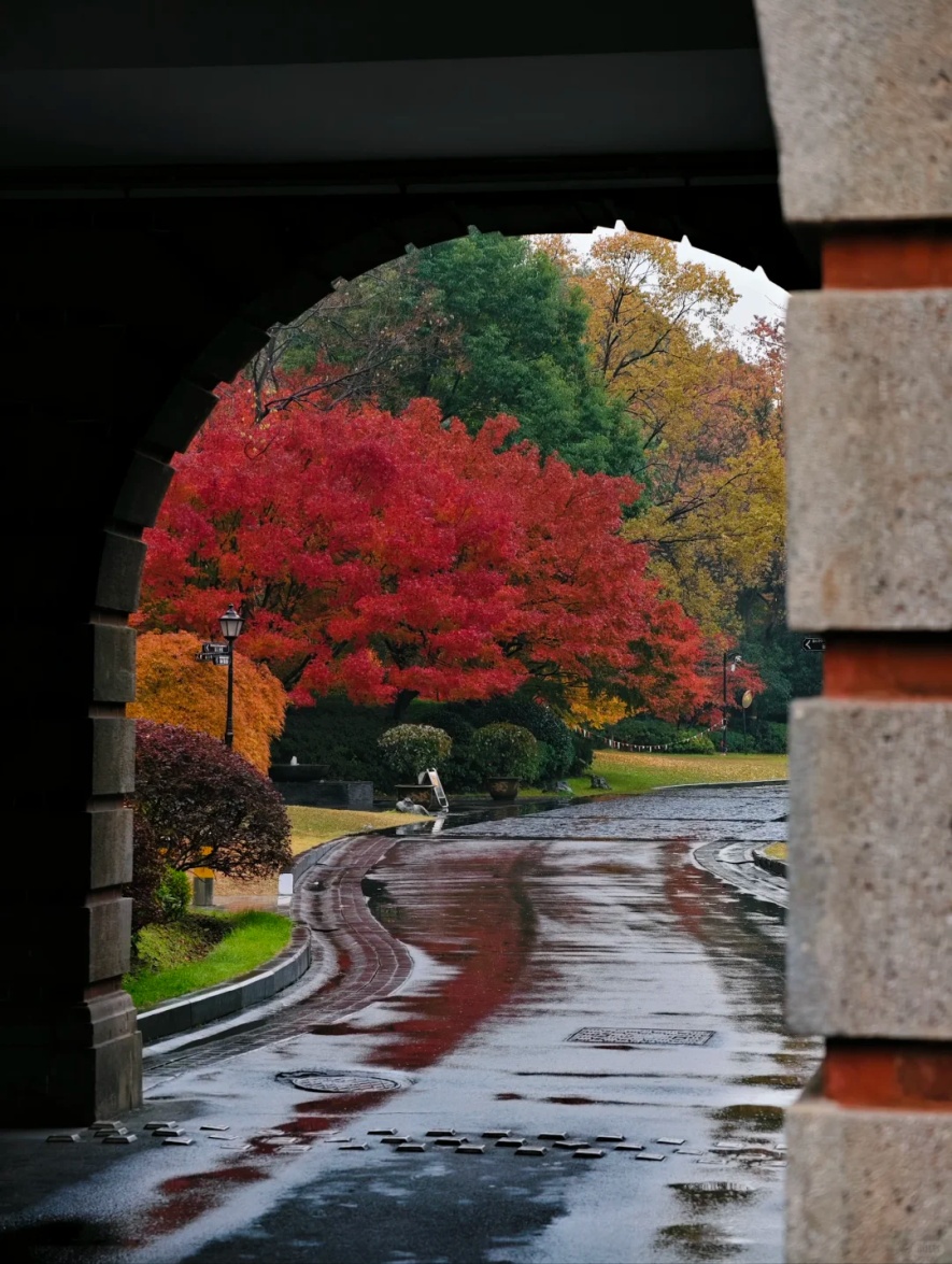 下雨天枫叶林里,草地上的落叶五彩斑斓。枫叶的渐变色全部可以找齐,还有酒店的复古欧式建筑加持,比画还美!