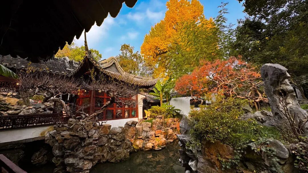 天高秋色深,野花烂漫无人管,曲径蜿蜒入画中。豫园的秋,一亭一台,一花一木,方寸之间,步移景异。