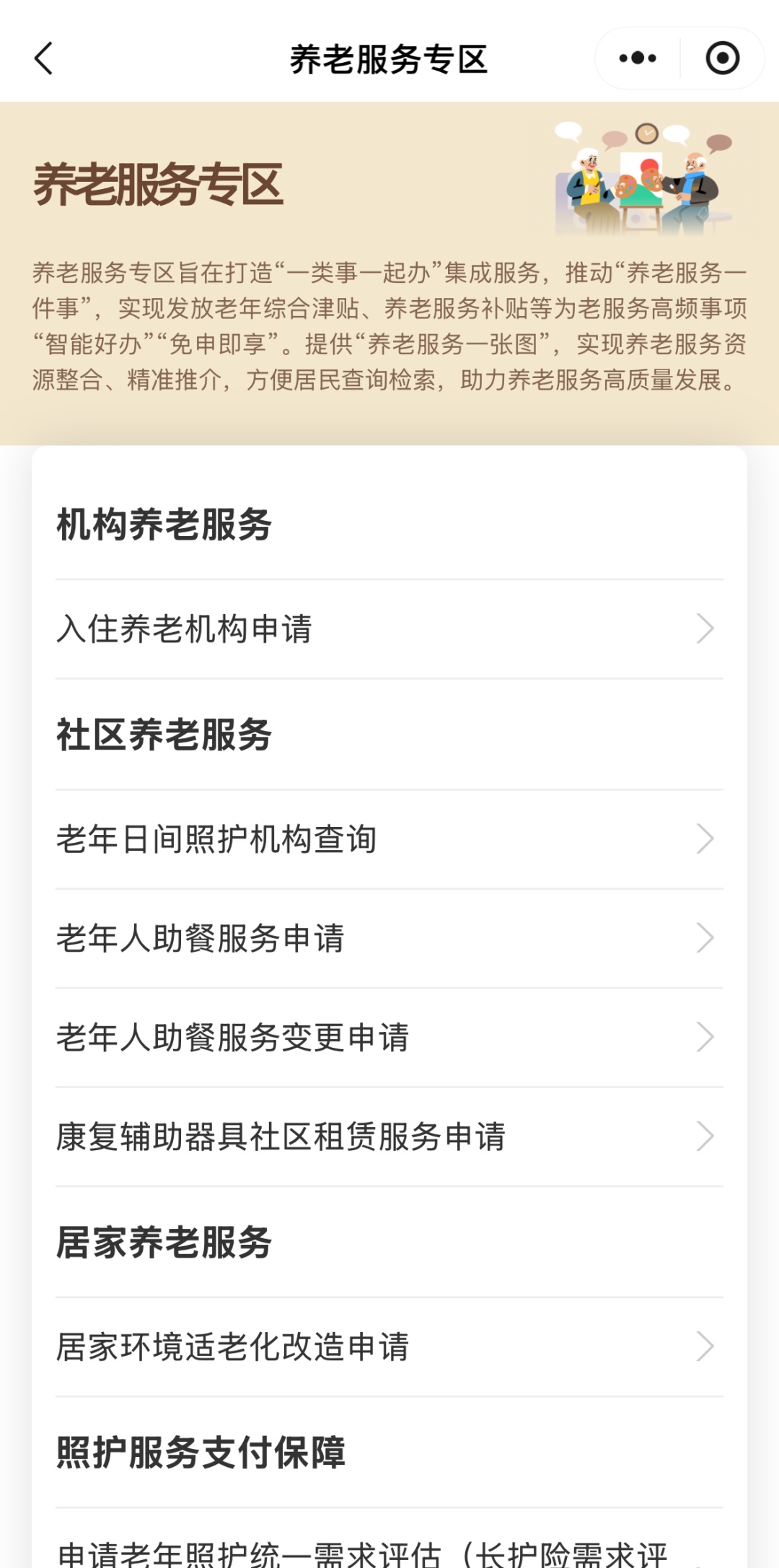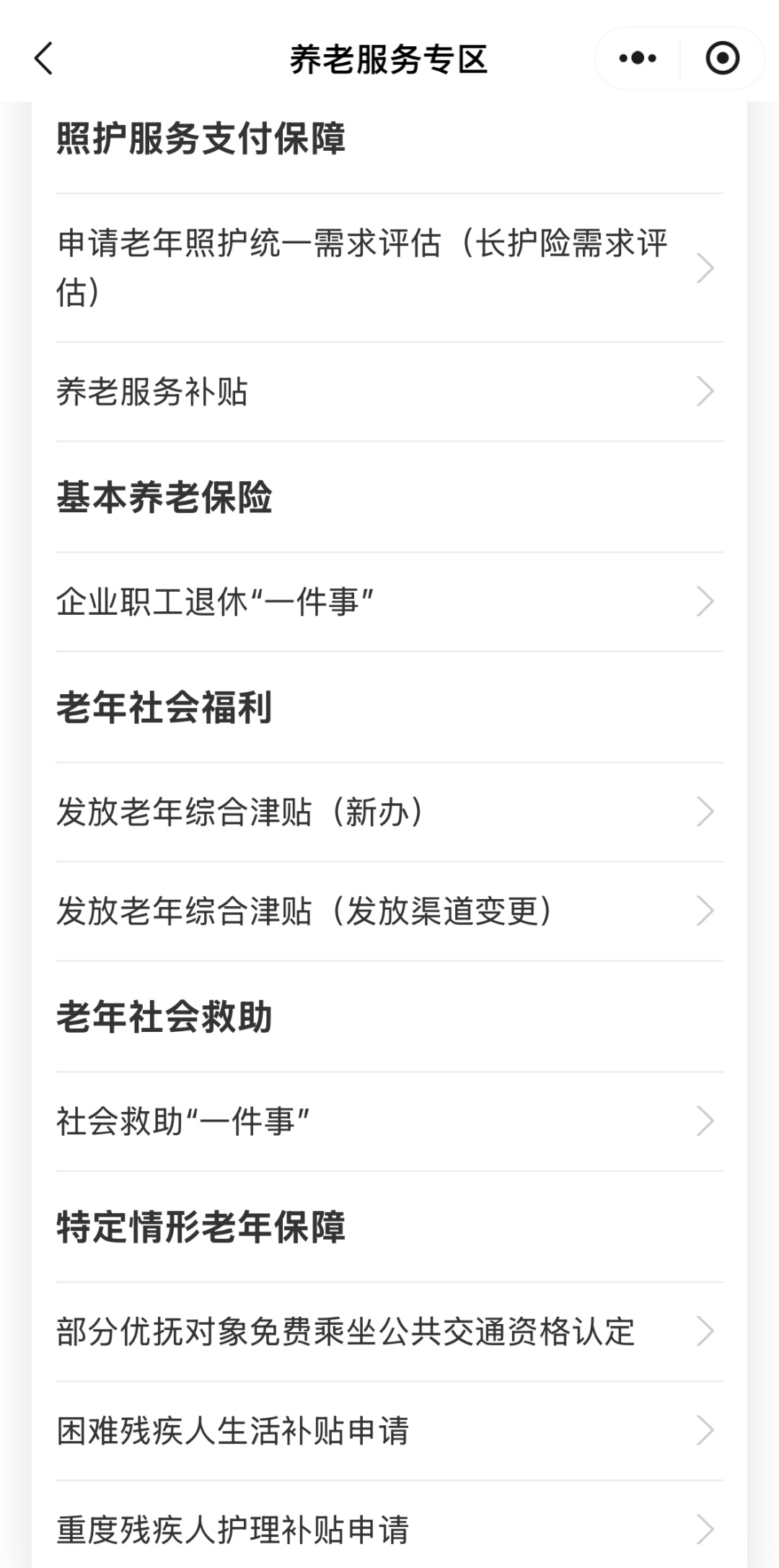养老服务专区旨在打造“一类事、一起办”集成服务,除了提供机构养老服务中的「入住养老机构申请」服务外,市民还能够在线办理发放老年综合津贴、养老服务补贴等老年人高频服务事项,轻松实现“智能好办”和“免申即享”的服务体验。