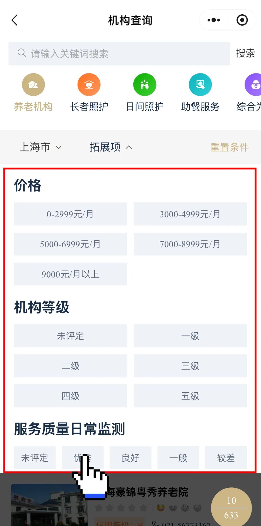 同时,市民还可以通过专区内的搜索栏进行直接查询,或者通过价格区间、机构等级、服务质量等标签快速筛选,以便找到满足您需求的养老机构。