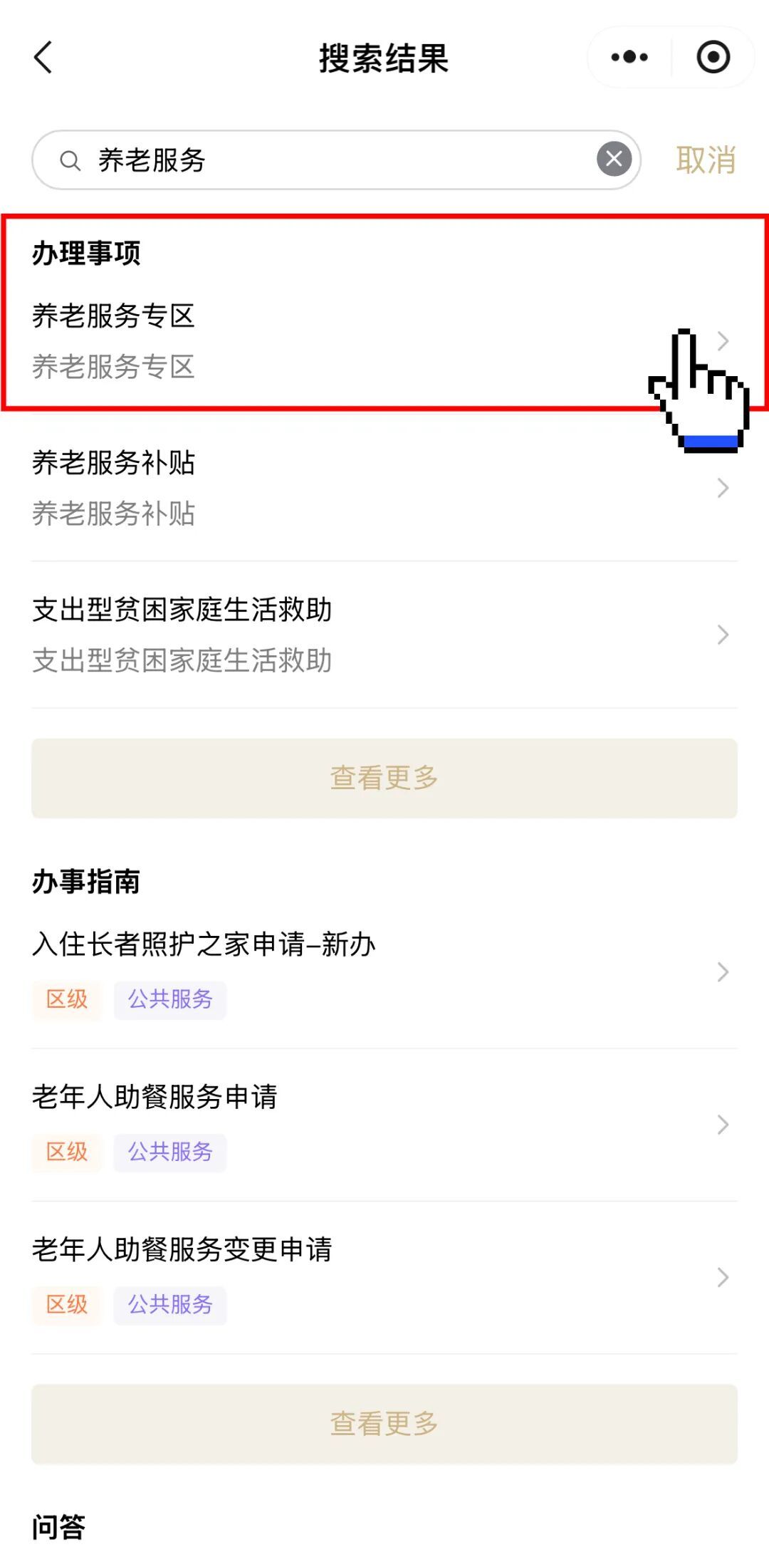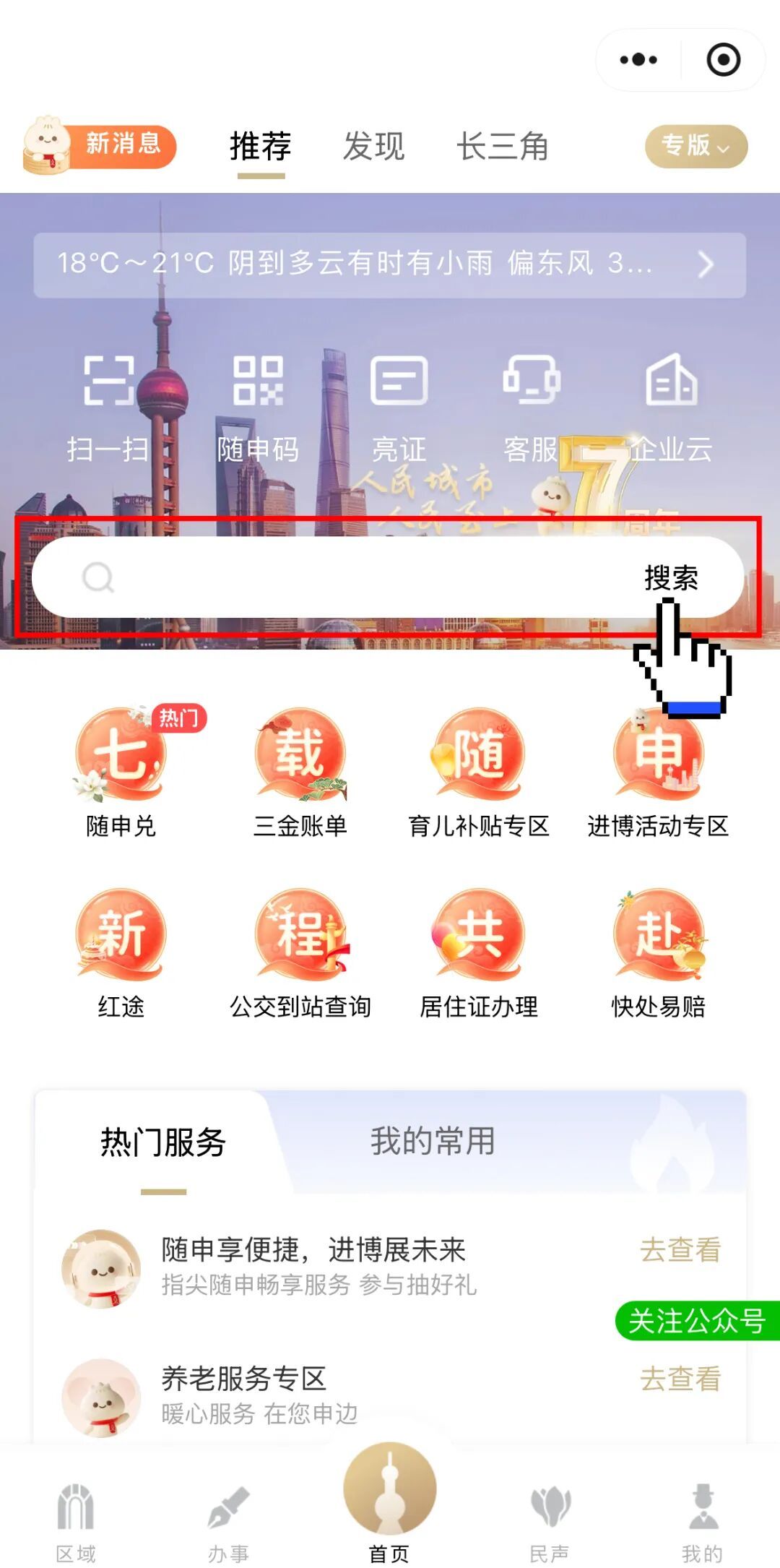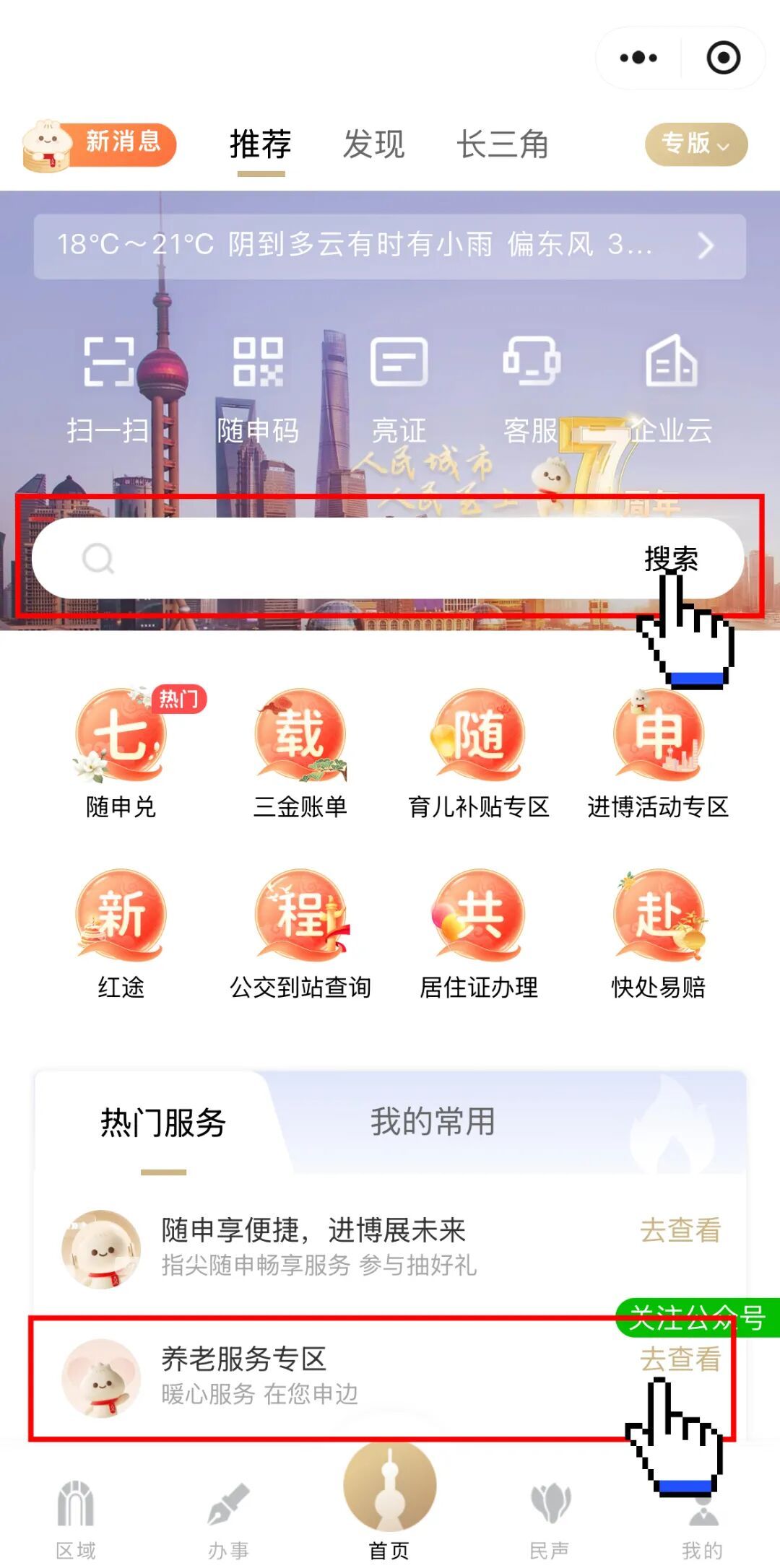 打开“随申办市民云”(APP/微信小程序/支付宝小程序),在首页的搜索栏输入「养老服务」,或通过首页热门服务中的「养老服务专区」进入,即可轻松办理各类相关服务。
