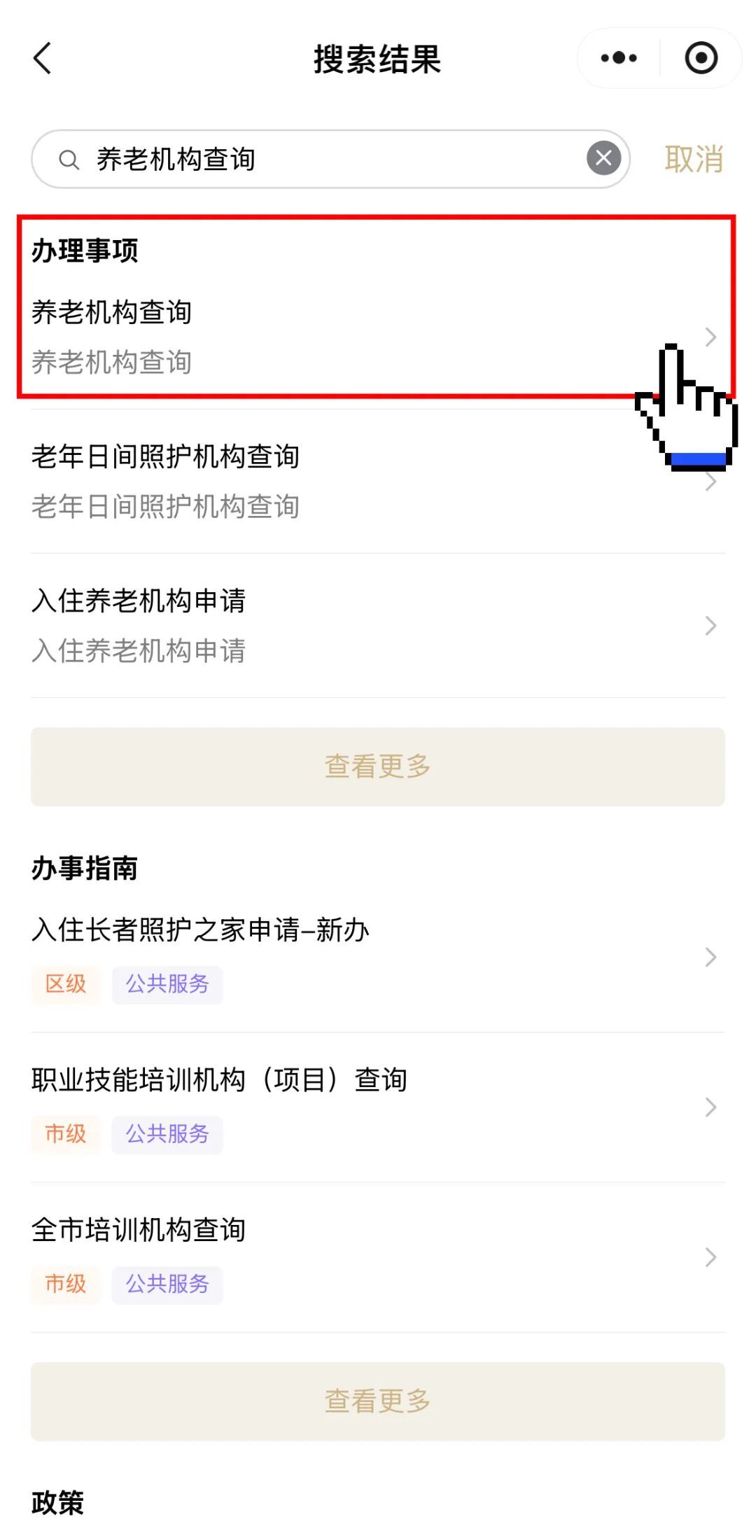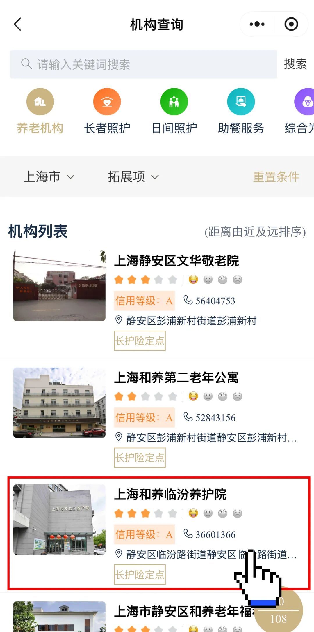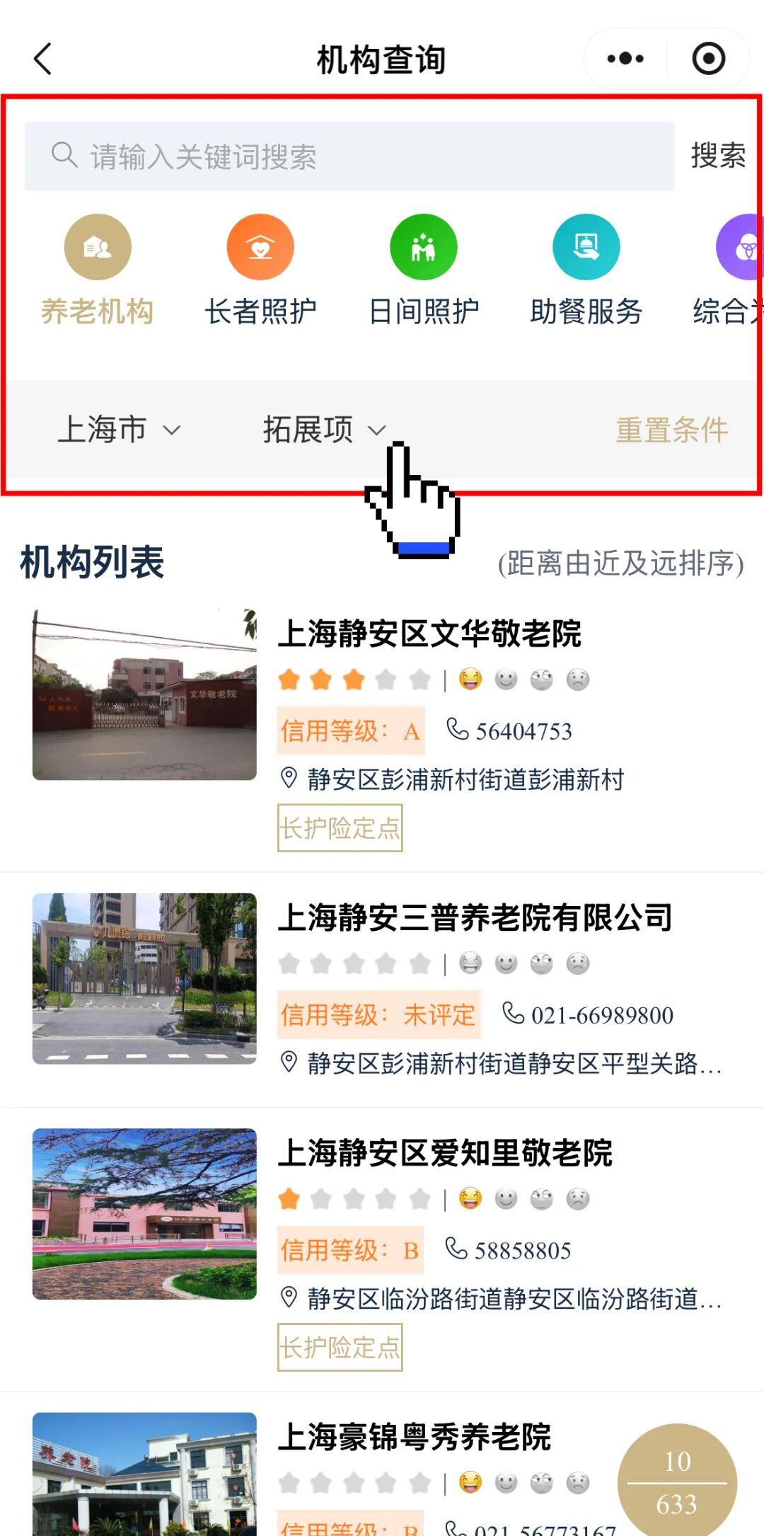 在「养老机构查询」专区,市民可以在线检索各类助老、为老服务机构的信息。服务将依据您的实时位置信息,优先推荐距离最近的养老机构。