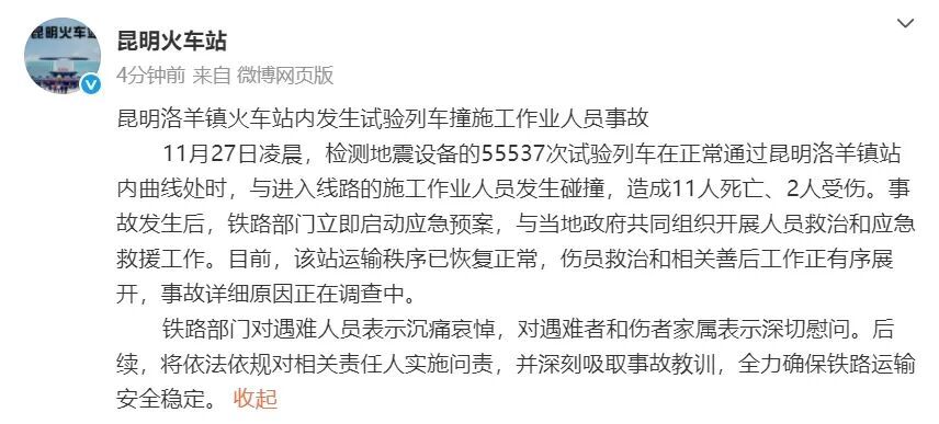 11月27日凌晨,检测地震设备的55537次试验列车在正常通过昆明洛羊镇站内曲线处时,与进入线路的施工作业人员发生碰撞,造成11人死亡、2人受伤。事故发生后,铁路部门立即启动应急预案,与当地政府共同组织开展人员救治和应急救援工作。目前,该站运输秩序已恢复正常,伤员救治和相关善后工作正有序展开,事故详细原因正在调查中。