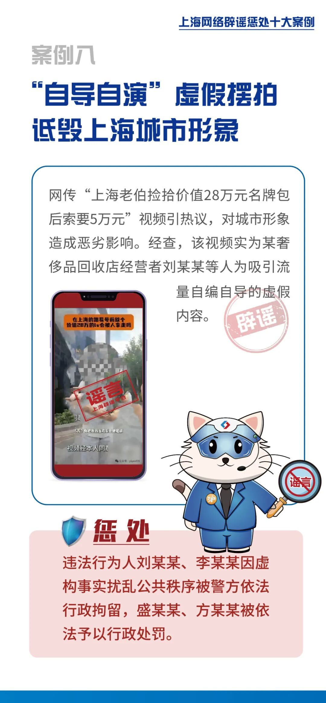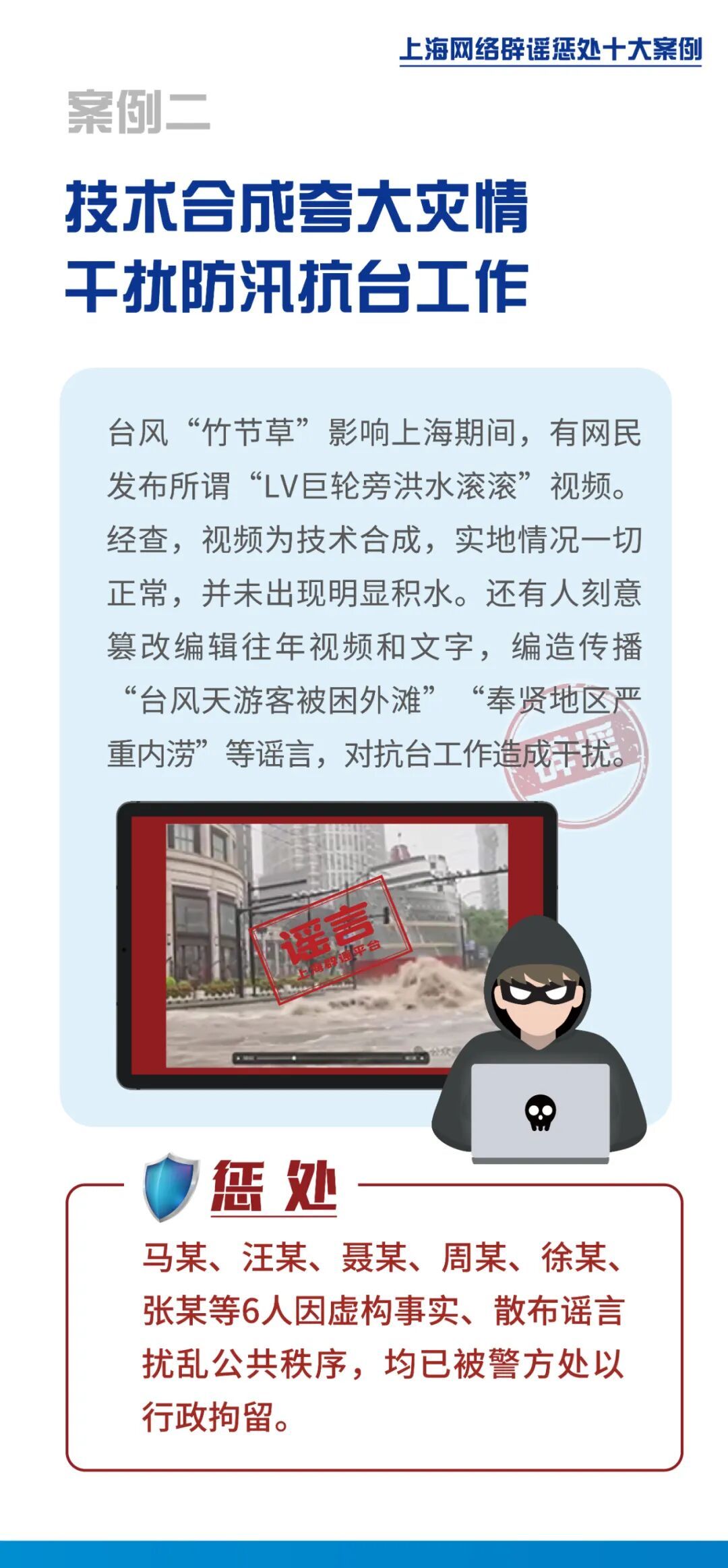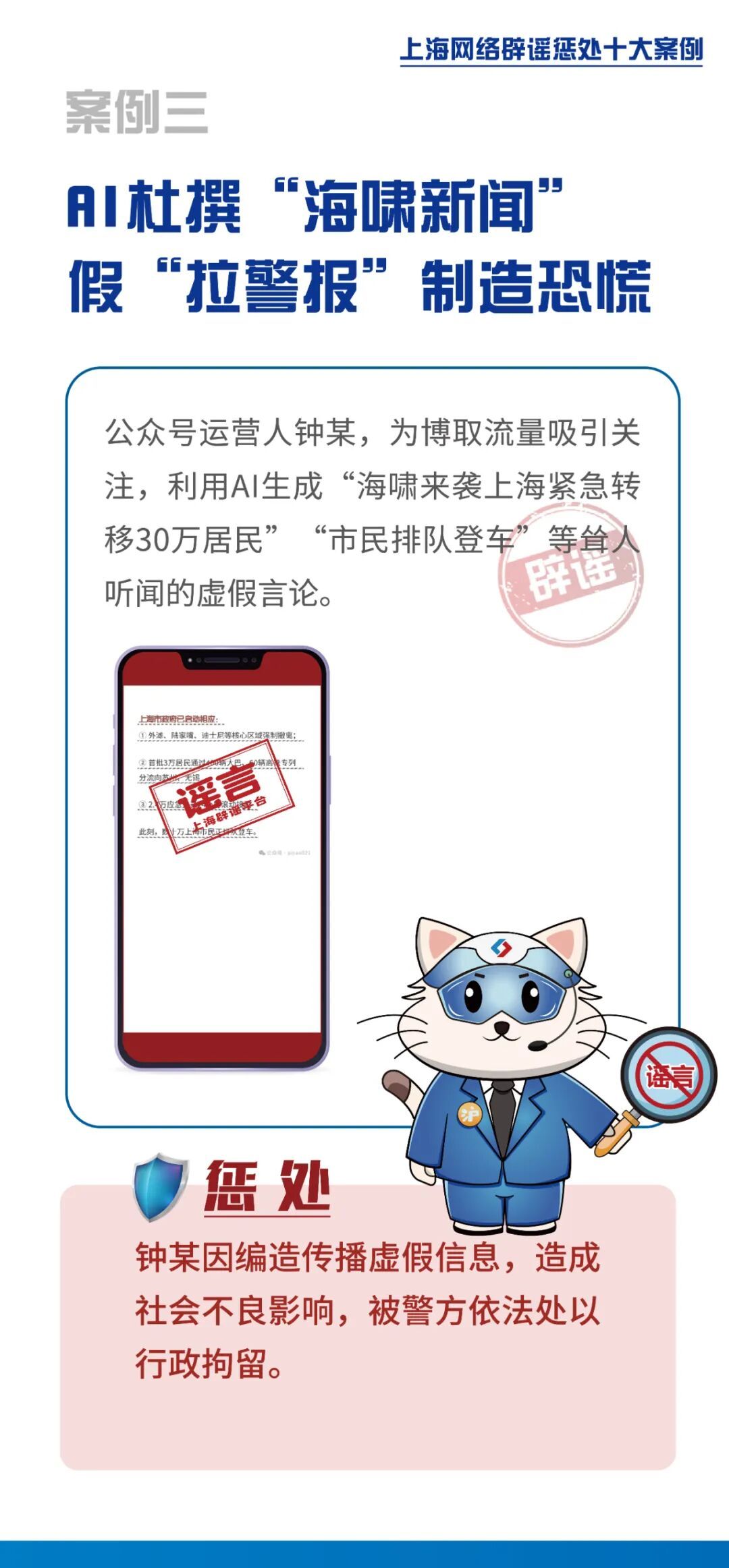 近年来,上海网信办携手相关职能部门,针对网民普遍关切的公共政策、社会民生、灾害事故、健康科普等各领域谣言,及时辟谣发声,还原事实真相,并对恶意造谣传谣行为依法依规予以惩处。 纵观《上海网络辟谣惩处十大案例》,有以下主要特征:一是AI等新技术已成为造谣传谣主要手段,如某网民利用AI生成并发布“海啸来袭上海紧急转移30万居民”虚假消息、“台风天LV巨轮旁洪水滚滚”谣言视频等,对防汛工作造成干扰;二是博流量、逐利益是造谣传谣主要动机,如某奢侈品回收店经营者为起号引流,自编自导自演所谓“上海老伯捡拾名牌包后索要5万元”虚假视频,对城市形象造成恶劣影响;三是相关造谣传谣人员均已被警方依法予以不同形式的处罚,包括封禁账号、处以行政拘留、采取刑事强制措施、判处有期徒刑等,为自己的违法行为付出应有的代价。 网络不是法外之地。宣传周期间还将通过线下活动,倡导广大网民理性上网不造谣,善辨是非不信谣,心有法度不传谣。抵制网络谣言,从你我做起。
