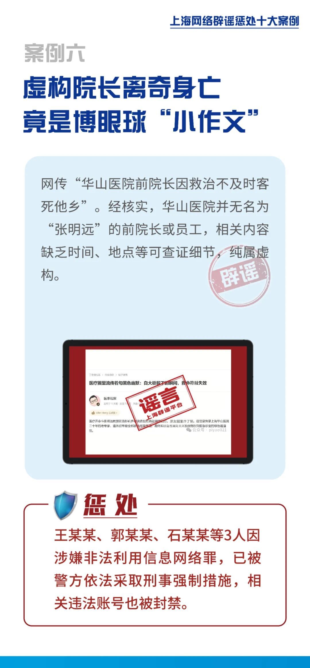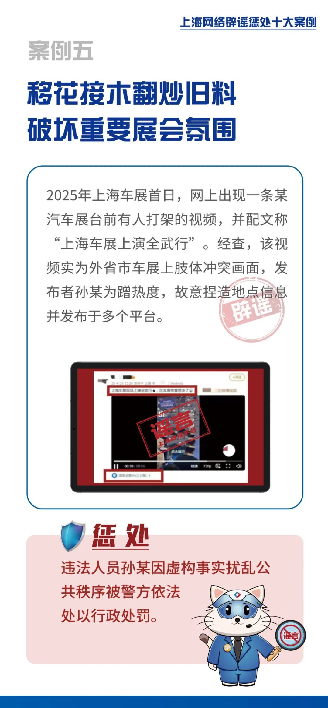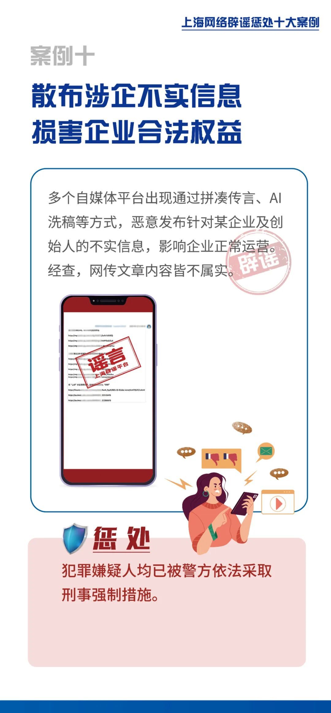 近年来,上海网信办携手相关职能部门,针对网民普遍关切的公共政策、社会民生、灾害事故、健康科普等各领域谣言,及时辟谣发声,还原事实真相,并对恶意造谣传谣行为依法依规予以惩处。 纵观《上海网络辟谣惩处十大案例》,有以下主要特征:一是AI等新技术已成为造谣传谣主要手段,如某网民利用AI生成并发布“海啸来袭上海紧急转移30万居民”虚假消息、“台风天LV巨轮旁洪水滚滚”谣言视频等,对防汛工作造成干扰;二是博流量、逐利益是造谣传谣主要动机,如某奢侈品回收店经营者为起号引流,自编自导自演所谓“上海老伯捡拾名牌包后索要5万元”虚假视频,对城市形象造成恶劣影响;三是相关造谣传谣人员均已被警方依法予以不同形式的处罚,包括封禁账号、处以行政拘留、采取刑事强制措施、判处有期徒刑等,为自己的违法行为付出应有的代价。 网络不是法外之地。宣传周期间还将通过线下活动,倡导广大网民理性上网不造谣,善辨是非不信谣,心有法度不传谣。抵制网络谣言,从你我做起。