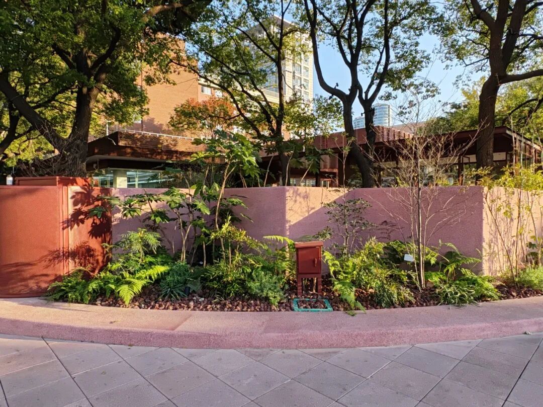 上海市城建档案馆附属绿地位于虹桥路与宋园路交叉口,半围合的庭院式布局让人眼前一亮。整片绿地巧妙融入景墙、绿植等元素,打造出虹桥路及宋园路两侧花境布置、中心庭院绿化及镜面水景。漫步其中,绿植错落有致,四季花卉争奇斗艳,镜面水景波光粼粼,在视觉上营造出通透开阔之感,身心也随着美好的景致放松下来。