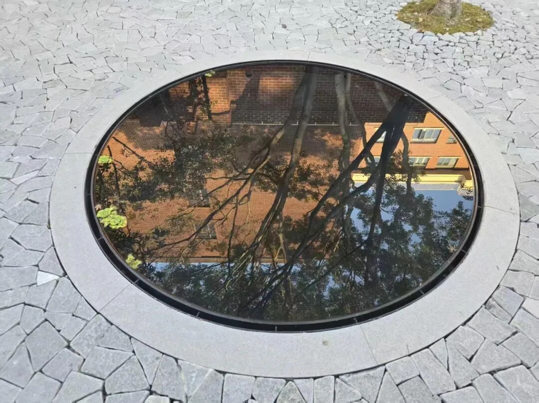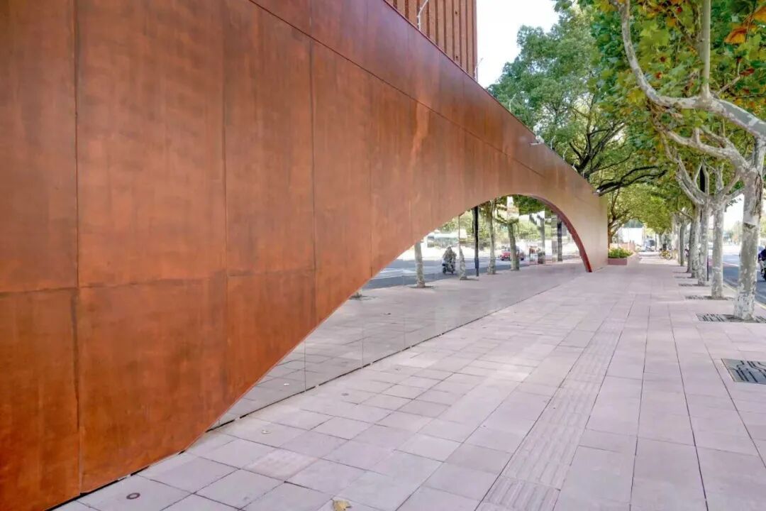 虹桥路沿线打造的镜面不锈钢历史长廊将档案馆建筑与流动的行人车辆同框,寓意着将城建历史记忆转化为推动城市发展的动力,为绿地增添了深厚的文化底蕴。