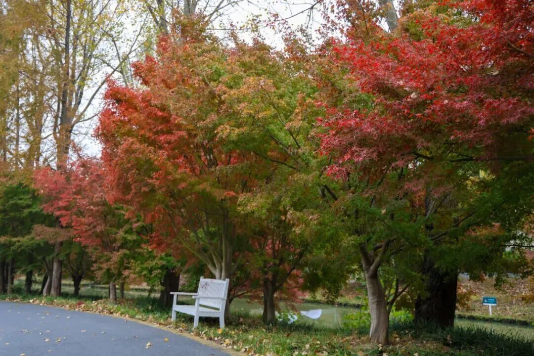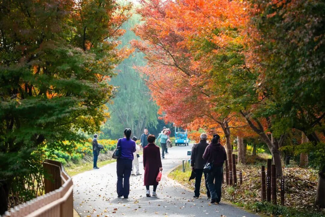 据悉,园内种植了鸡爪槭、美国红枫等20多个品种、近百亩的枫树,目前正值变色阶段。与此同时,地肤也已进入最后观赏期,大部分转为浓郁的红褐色,犹如铺展在大地上的绒毯。细叶芒、格桑花、小兔子狼尾草等植物错落分布,与枫树相映成趣。