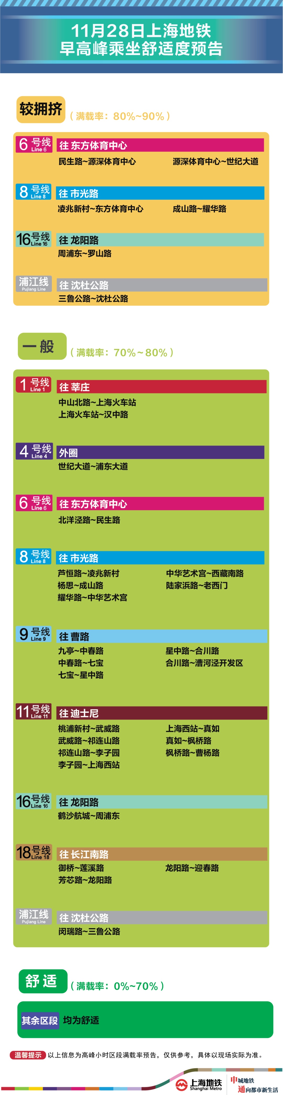 为提升上海地铁早高峰期间出行服务水平,提升乘客乘坐体验,上海地铁向乘客提供乘坐舒适度预告,方便乘客提