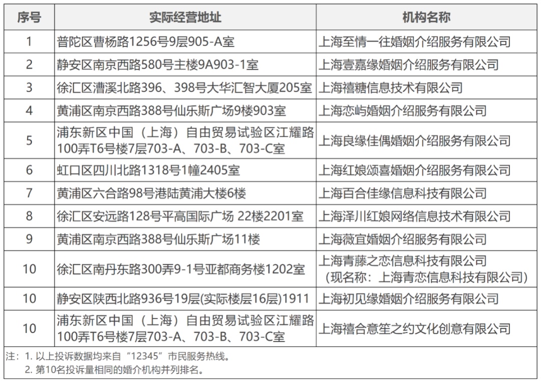 2025年10月“12345”市民服务热线数据显示,最高的两家单位上海至情一往婚姻介绍服务有限公司、上海壹嘉缘婚姻介绍服务有限公司都是6次被投诉。此外,发现部分曾上榜的婚介机构变更注册地址后,其原经营地址有新的婚介机构入驻运营,且该新入驻机构亦存在较多投诉。典型案例为:原“上海禧合意笙之约文化创意有限公司”的经营场所,现为“上海良缘佳偶婚姻介绍服务有限公司”的注册地址。