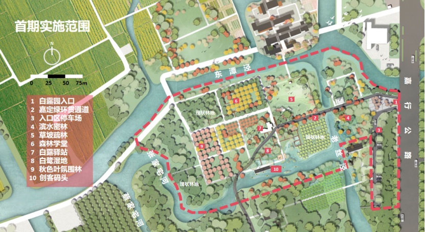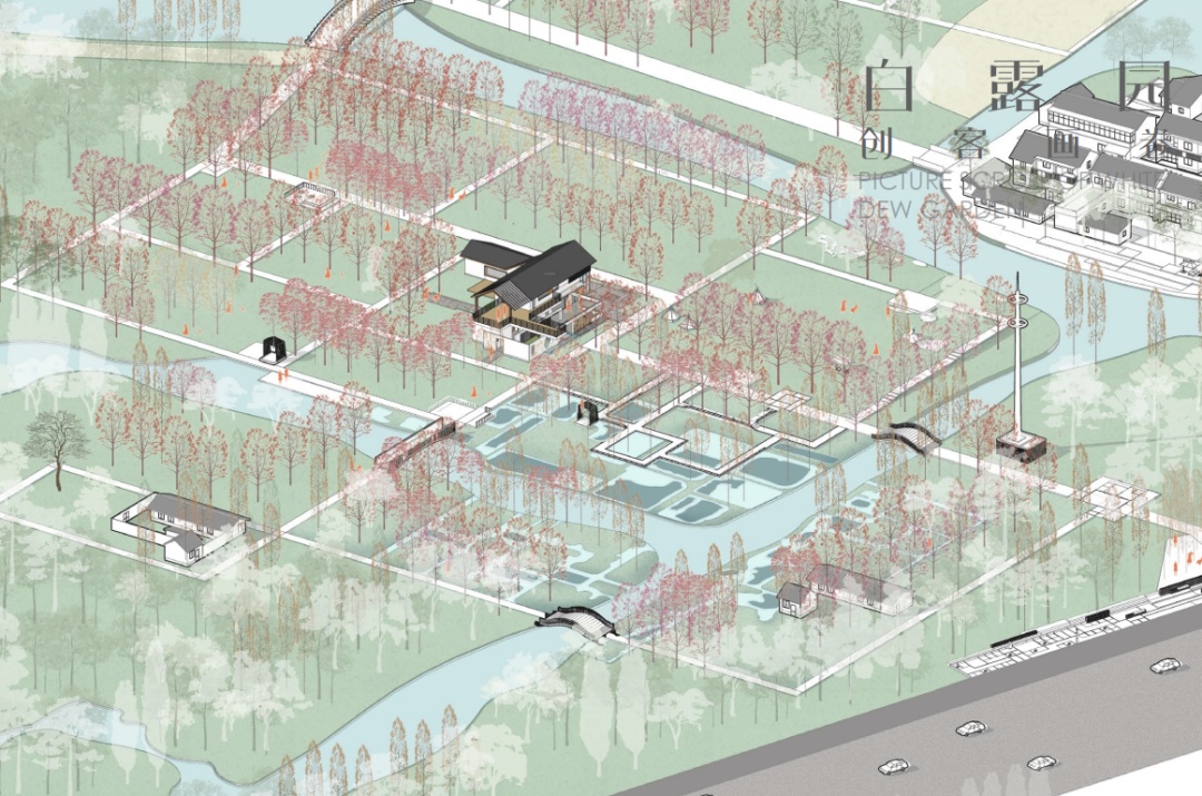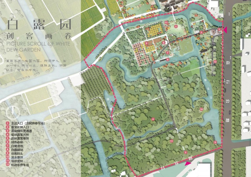 白露园由上海市绿化市容行业领军人才庄伟大师团队设计。项目规划范围东至嘉行公路,西至蔡家宅河,南至昌徐路,北至东田泾,总面积约13.5公顷。作为嘉定新城绿环三大核心节点之一——“创客森林”的东门户,白露园承载着连接城乡、融合生态与人文的重要使命。园子的设计灵感来源于二十四节气中的“白露”,设计师运用“白露”节气的色彩,通过做优生态林、做精小花园、做实服务点三大策略,打造一片与节气共鸣、与自然共生的秋色叶主题林。建设完成后,这里将呈现一处媲美法国“枫丹白露”的诗意景观,不仅是候鸟迁徙的休憩地,更是一处功能复合、林田相拥的乡村公园。
