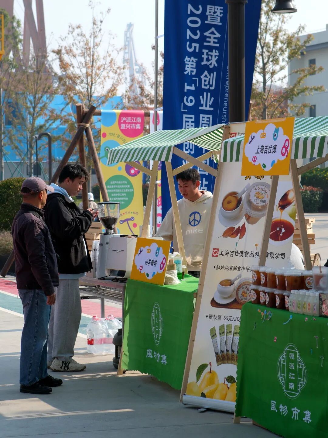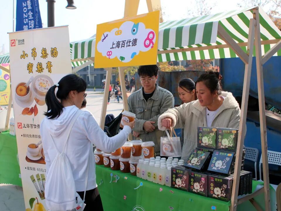 迎龙村带来的创新方糕软糯中透着巧思新意,搭配精致的手作摆件尽显乡土匠心;金品荟萃商城则将“童年回忆”拉满——大白兔奶糖裹着熟悉的奶香甜意,冠生园蜂蜜润着自然的清甜,爱森肉套餐更是承载着家常餐桌的安心味道;上海鼎丰的腐乳及调味品咸香浓郁,是传承多年的老上海风味担当;上海小磨盘的绿色豆制品在现场煎制的滋滋声里豆香四溢,新鲜健康的气息直钻鼻尖;上海百仕德的小吊梨汤、蜜梨膏与冰酿饮品清新润肺,甜而不腻的口感让人一口便觉清爽;山羊咖啡的稻香咖啡更是别出心裁,醇厚的咖啡香中混着淡淡的稻米气息,碰撞出独特的治愈滋味。每个摊位前都挤满笑着的人,每一款都别具特色,不少游客当场打包带走这份特色风味。