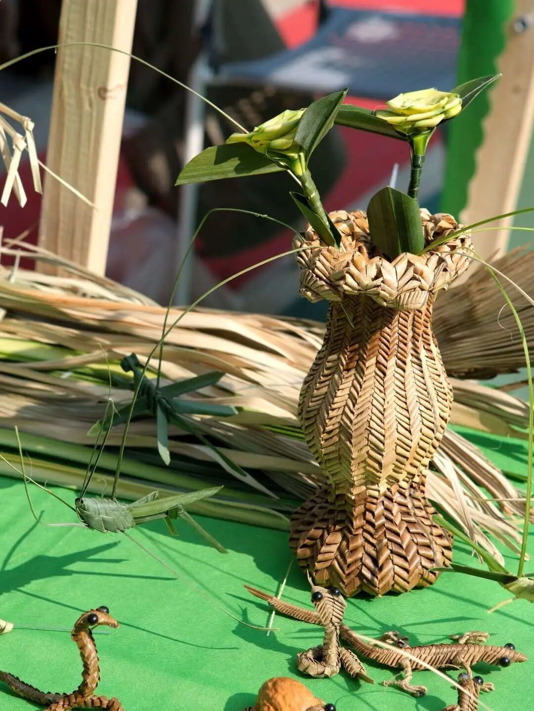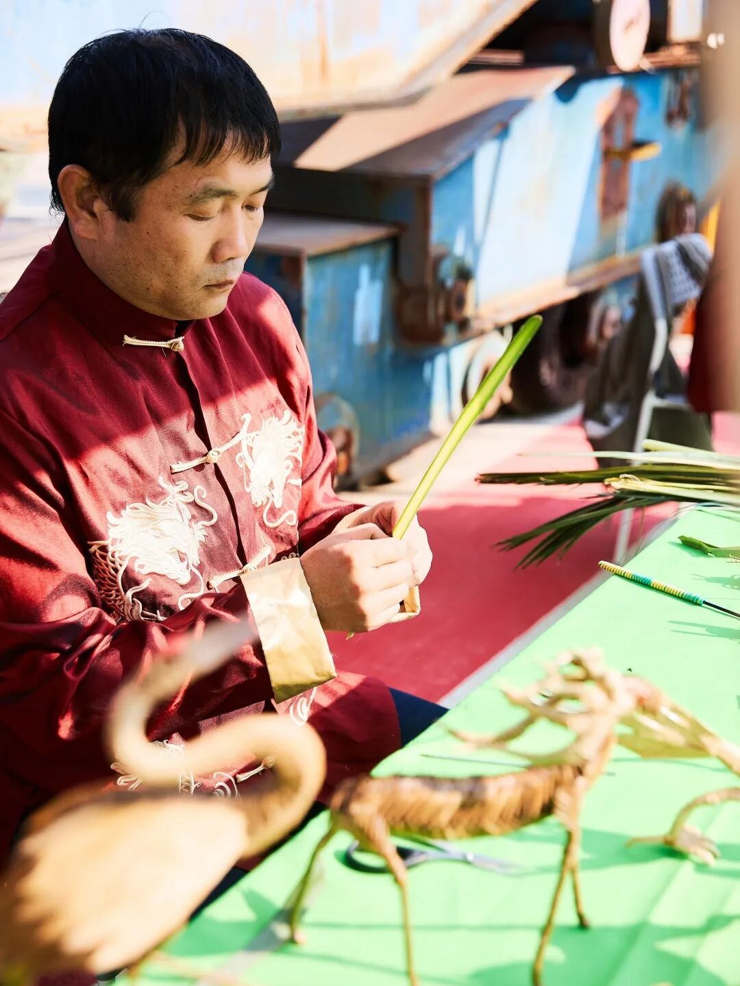 糖画摊前总围着翘首以盼的孩童,匠人以铜勺为笔、饴糖为墨,手腕轻转间便勾勒出展翅金龙,还有很受追捧的哪吒造型,晶莹的糖翼在阳光下泛着琥珀光晕。捏面人的案板上,面团在指尖幻化成齐天大圣的紫金冠、玉兔的粉嫩耳朵,刚成型的大熊猫就被迫不及待的小朋友捧在手心。棕编传人指间翻飞,青棕叶化作振翅蚱蜢、盘踞青蛇,草虫的触须仍在微微颤动。