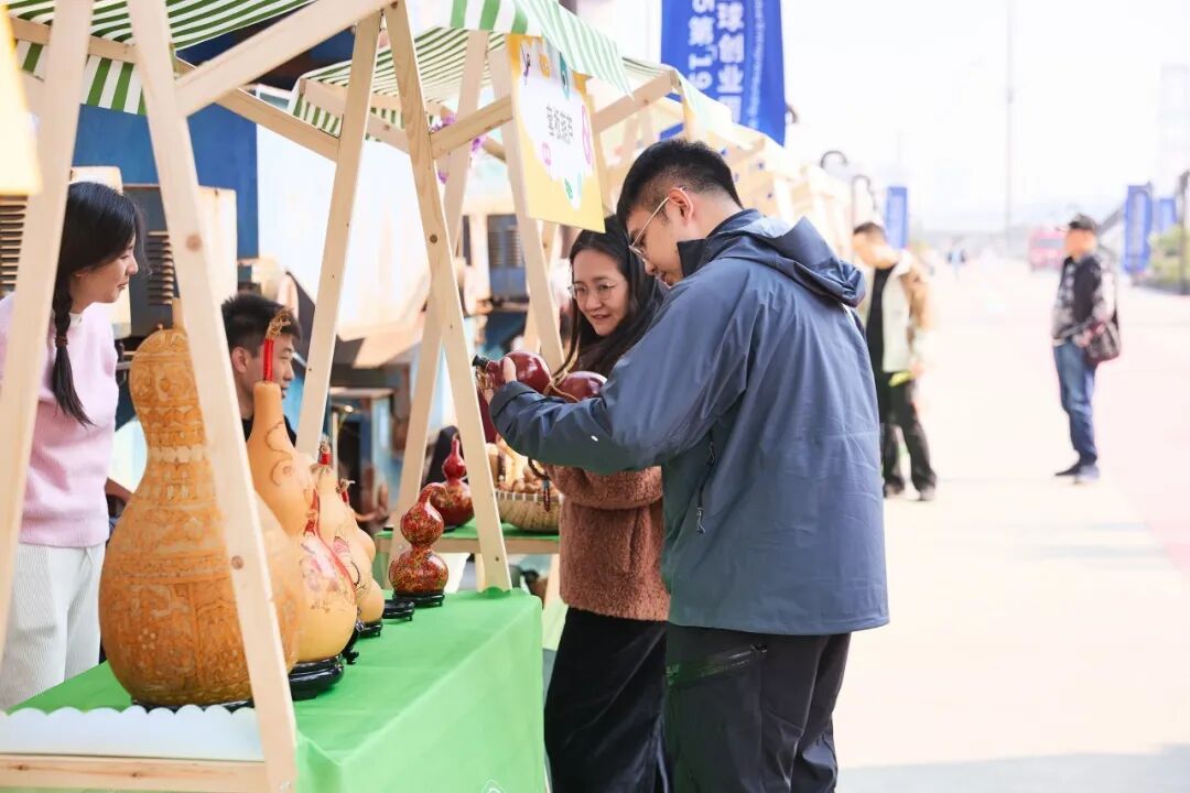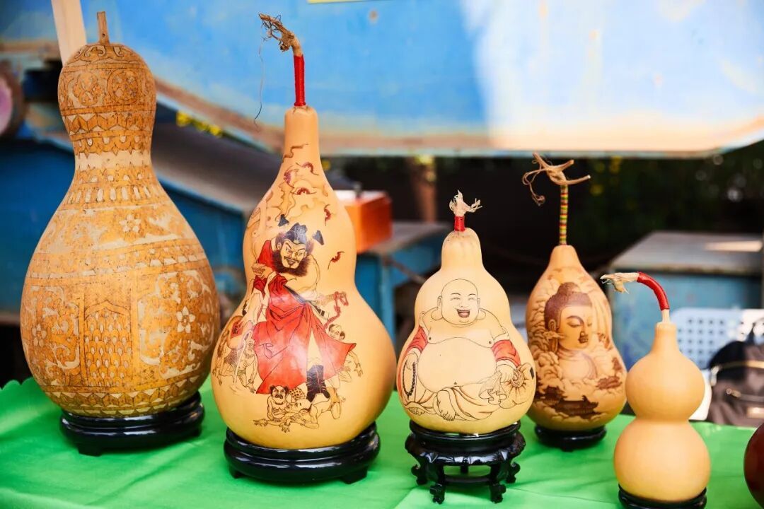 汇东村套版葫芦作为闵行非遗的明珠,在市集中央熠熠生辉。数十种镂刻精妙的葫芦陈列如艺术长廊,从福禄纹样到神话故事,最令人驻足的竟是戴着红帽的圣诞老人版本——传统匠艺与西洋节味的跨界对话,让年轻游客纷纷举起手机,惊叹于古老非遗的破圈魅力。