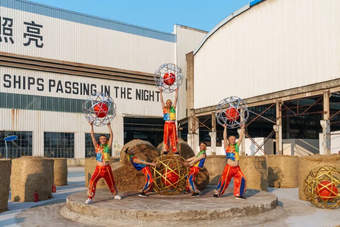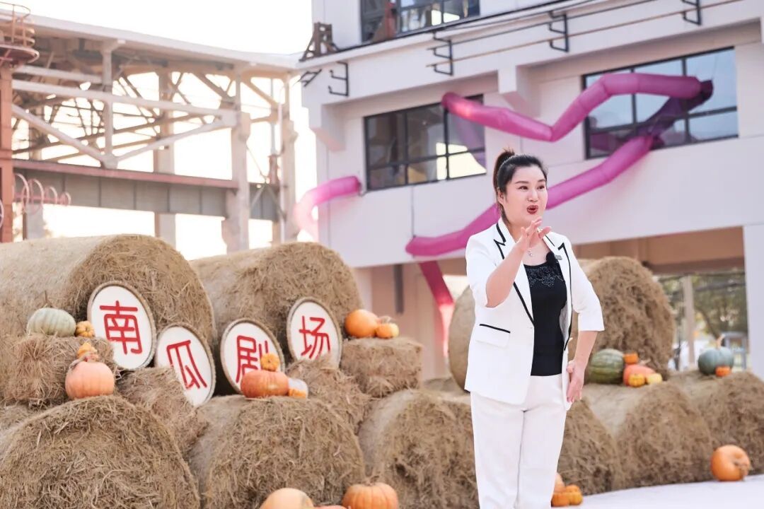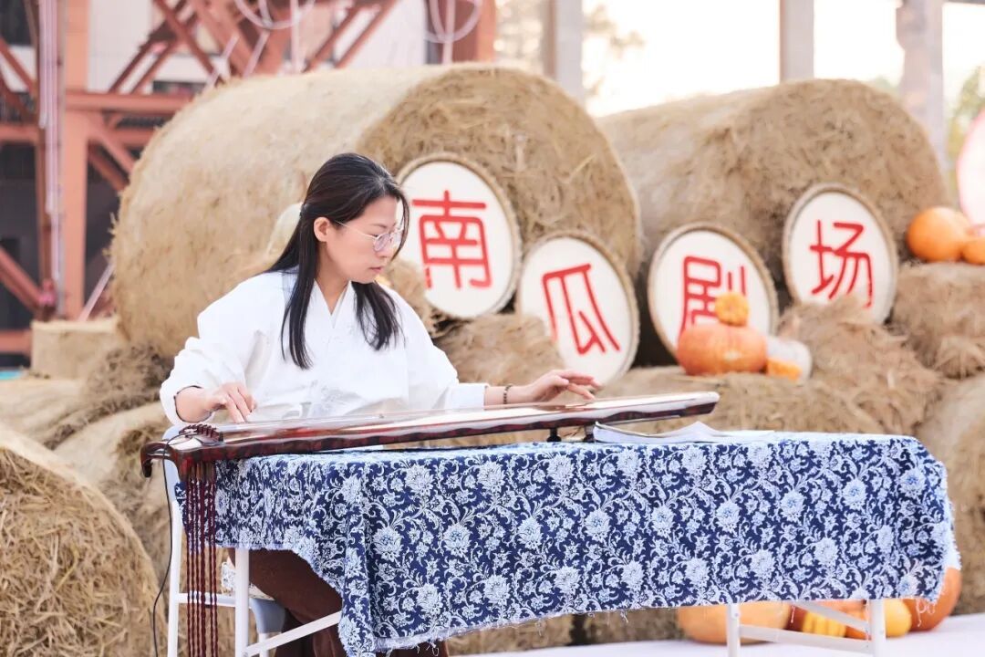 最妙的是,表演还移步至新落成的沪派江南南瓜剧场——以龙门吊为景框,以堆叠的草垛为舞台背景,金灿灿的南瓜点缀其间,工业风与乡村风激烈碰撞,别有新趣。古琴余韵在稻浪间飘荡,越剧唱腔与钢铁构架共鸣,传统艺术在田园诗境中焕发出沪派江南的独特韵味。观众坐在草垛座椅上,在稻香与琴韵的交织中,领略了一场真正“活”起来的民俗传承。