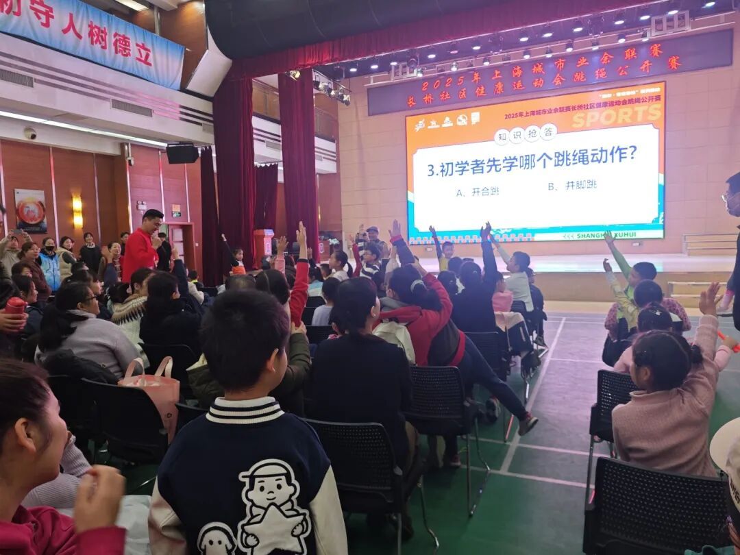 本次赛事吸引了60余组家庭参与。赛事不仅设置了30秒单摇跳(轮换跳)、30秒单摇跳(并脚跳)和30秒亲子一带一单摇跳等三个竞赛项目,还融入了知识抢答、亲子跳和花样跳绳表演等互动环节。知识抢答巧妙结合体育与健康常识;亲子跳让家长与孩子在挥绳中增进情感;花样跳绳展示则让孩子们将课堂所学,转化为舞台上的自信表达。