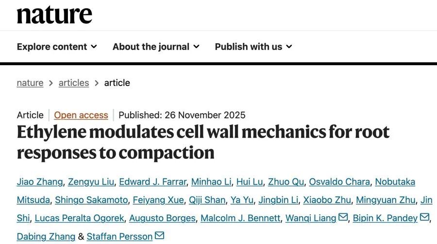 近日,上海交通大学生命科学技术学院张大兵和梁婉琪教授团队联合丹麦哥本哈根大学斯塔凡·佩尔松(Staffan Persson)教授团队、英国诺丁汉大学马尔科姆·J·本内特教授(Malcolm J. Bennett)团队在国际顶尖学术期刊《自然》上发表题为《乙烯通过调控细胞壁力学特性介导根系响应土壤板结》(Ethylene modulates cell wall mechanics for root responses to compaction)的最新研究,首次揭示了植物根系如何利用工程学原理适应板结土壤:通过主动响应积累的乙烯,精细调控细胞壁厚度,从而促进根系增粗,提高穿透能力以适应土壤板结。
