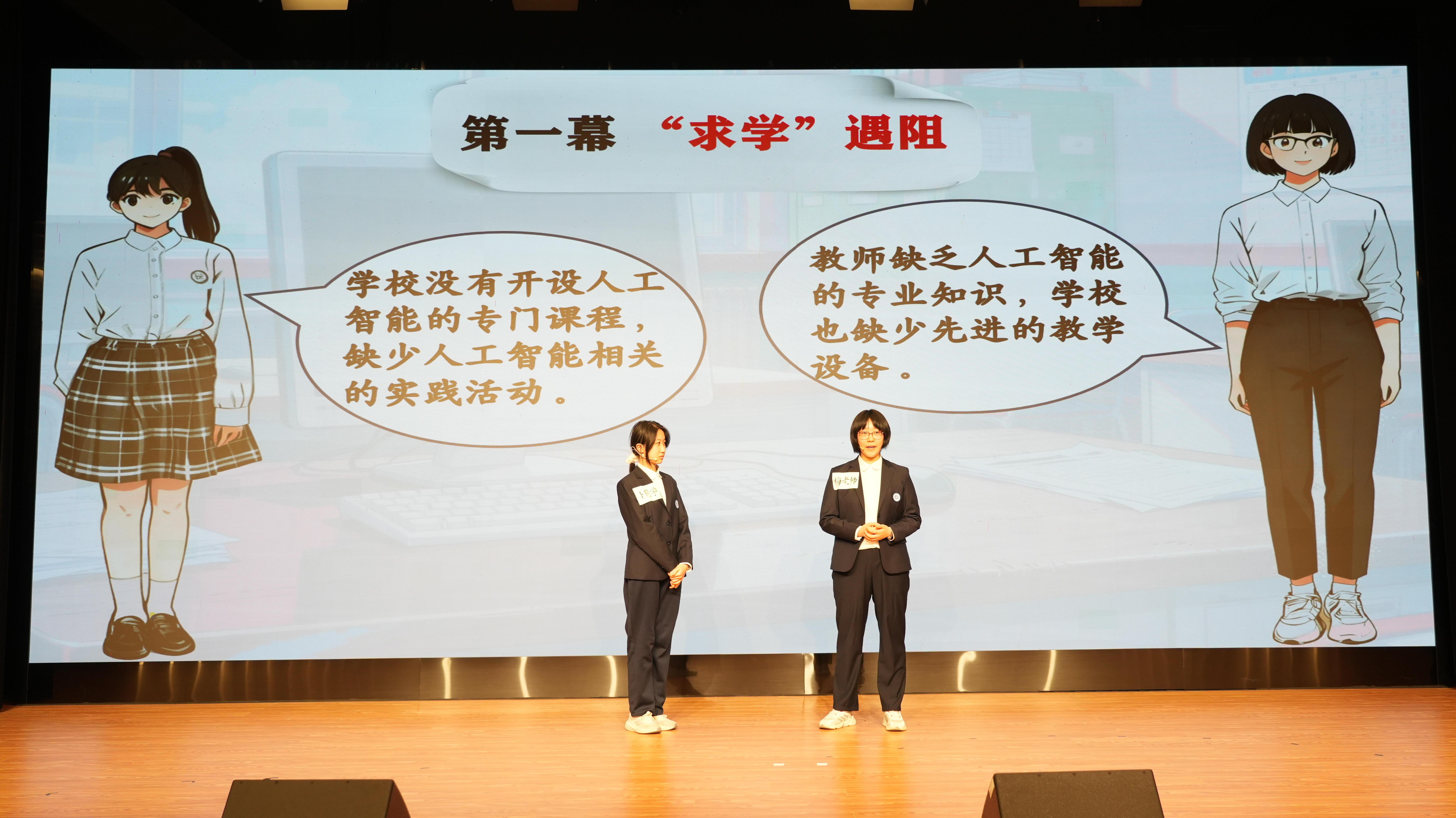 现场,曹杨二中、晋元高级中学、曹杨中学、同济二附中、甘泉外国语学校、长征中学、中远实验学校及青少年体育运动学校的学生团队,围绕人工智能教育、文旅资源开发、AI使用规范、智慧养老、文物保护、儿童友好空间建设、体育场馆管理、老年人数字鸿沟破解、社区治理优化和青少年心理健康保障等多个主题,以多人演讲、角色化演讲、情景剧演绎、圆桌论坛等逐一展示调研成果。