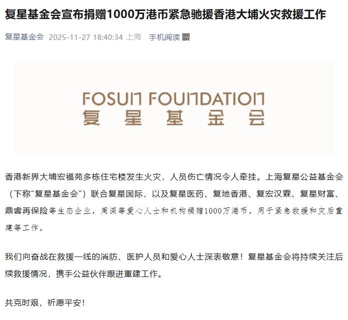 11月26日,香港新界大埔区宏福苑发生火灾,造成重大人员伤亡。灾情牵动全体中国同胞的心,沪上民营企业纷纷伸出援手,驰援香港大埔灾后救援→