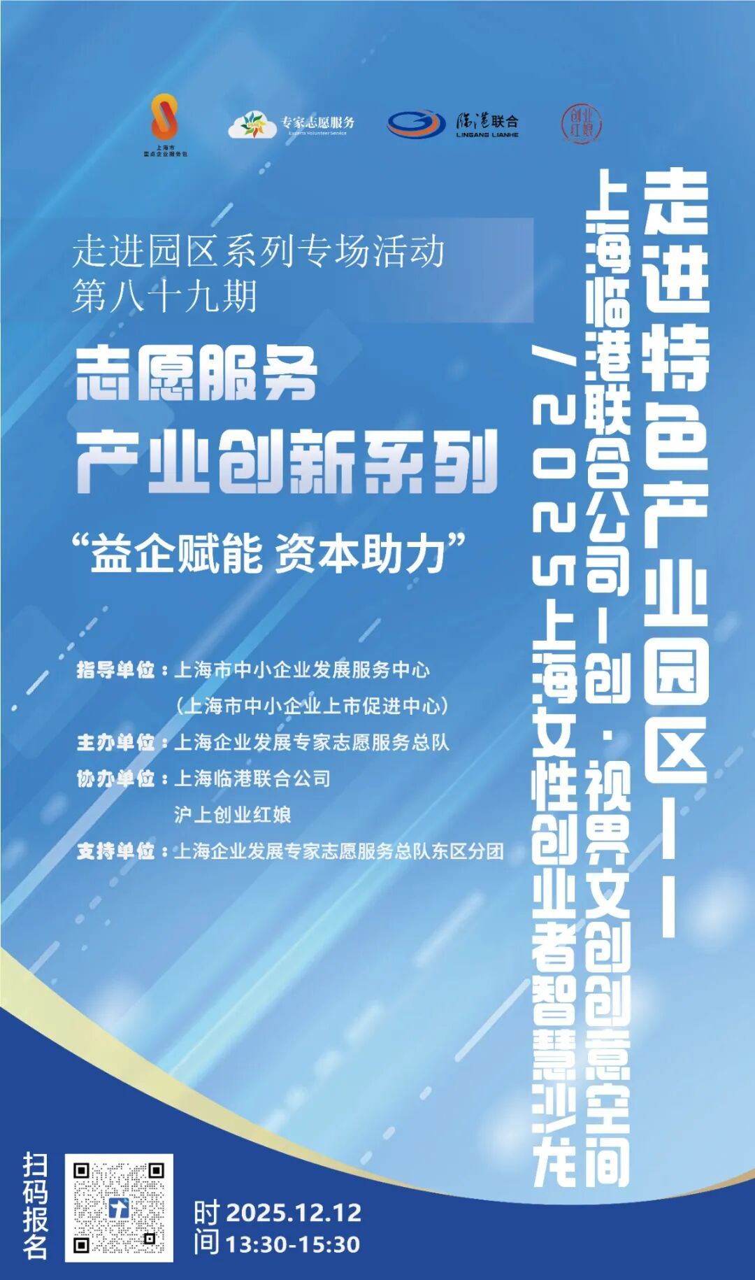 为助力园区企业链接优质产融资源,在上海市中小企业发展服务中心的指导下,在上海市国际股权投资基金协会的支持下,上海企业发展专家志愿服务总队联合众多机构共同为全市中小企业搭建产投融资加速平台,并分享产业融合、投融资对接、行业前景分析、政策解析等经验知识,赋能企业经营成长,推动产业创新发展。 产业创新系列第89期特别联动海临港联合发展有限公司、上海视觉艺术学院等单位共同举办女性创业者专场,欢迎积极报名! 扫码报名