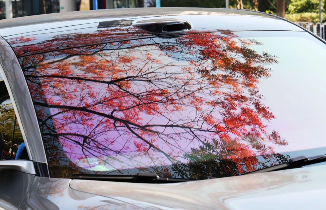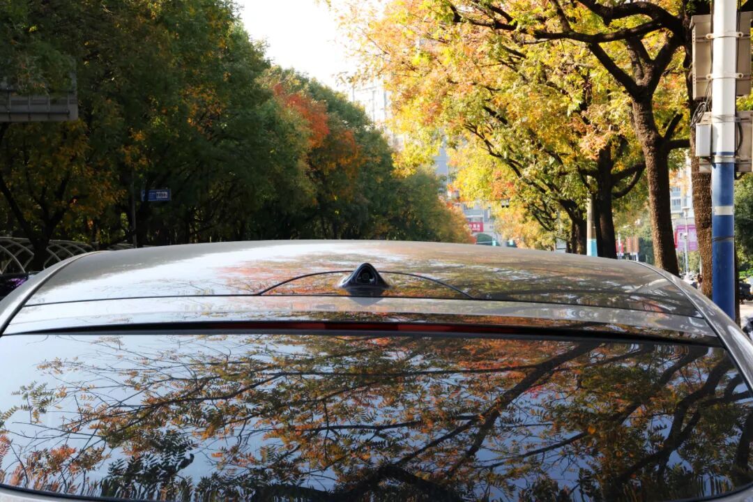 连车窗都成了调色盘,红、黄的树影在玻璃上一笔一笔晕开。