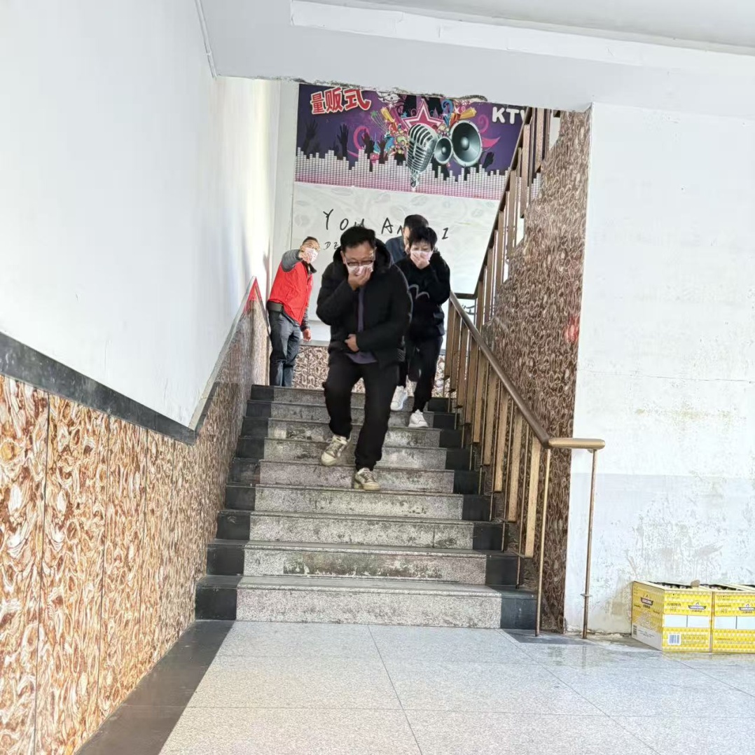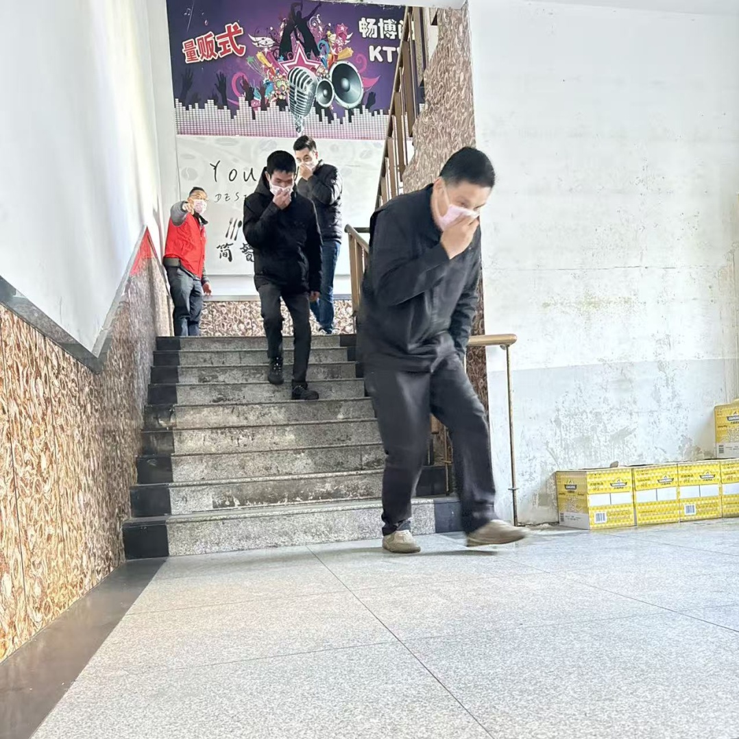 随着告警声的响起,现场人员发现“火情”,商铺内迅速启动消防应急预案。“顾客”在工作人员的引导下,按照预定疏散路线,用湿毛巾捂住口鼻,低姿弯腰,快速、有序地撤离至指定的室外安全集结区。本次演练有效增强了人员在应对突发消防事件时的组织能力和应急反应速度。