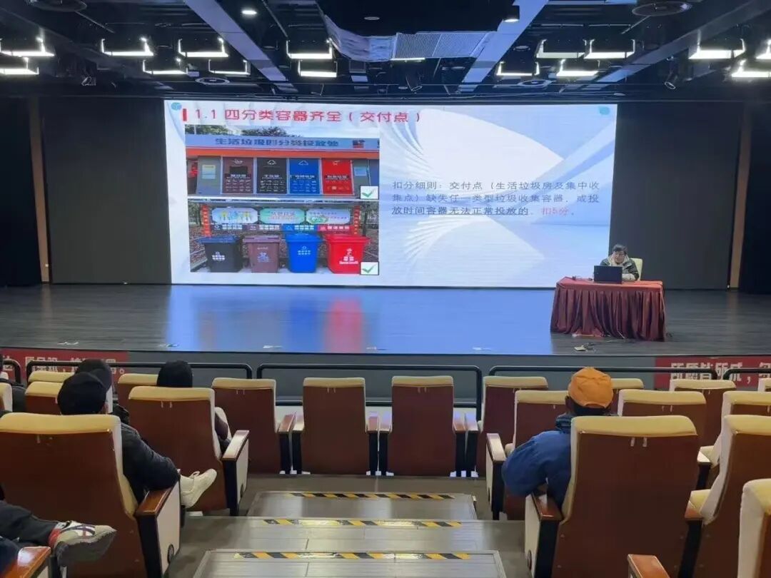 内容涵盖了容器设置规范性、宣传告知清晰度以及分类实效等关键维度,并结合近期检查中发现的共性问题与典型案例,进行了深入浅出的剖析,使与会人员对考评标准有了更全面、更深刻的理解。
