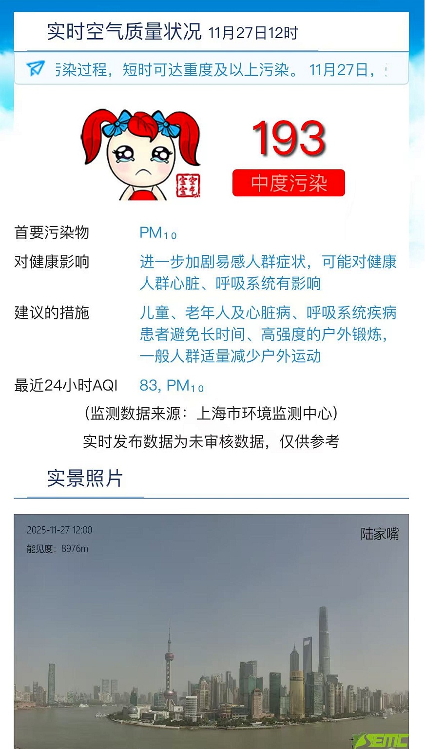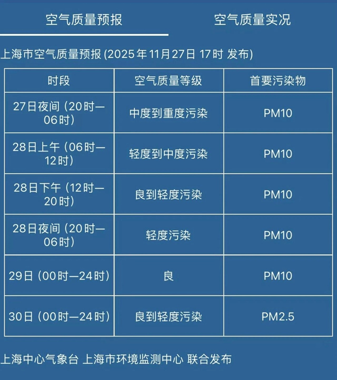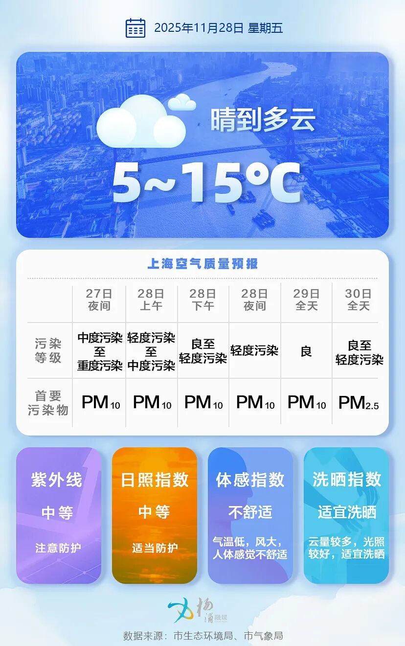 天气早知道 Nov 28 晴到多云,局部有薄冰 体感冷嗖嗖,注意防护浮尘 这两天 上海白天阳光普照、气温适宜 就是早晚温差有点大 不少市民表示: 魔都的秋天还是很给面子的 但昨天(11月27日) 受上游沙尘输送影响 上海出现PM10轻度污染过程 短时可达重度及以上污染 昨天盛行西北风 形成有利于输送污染的通道 27日中午时分查询显示 上海空气质量达到中度污染 ↓↓↓ 上海市环境监测中心预报员表示 这波污染预计将持续一天 昨天下午空气质量为轻度至中度污染 夜间为良至轻度污染 11月28日,空气质量良至轻度污染 11月29日,空气质量良 温馨提醒 沙尘污染期间,广大市民应减少外出,避免暴露,如需外出,请做好个人防护措施;特殊人群(如儿童、老人、孕妇、慢性病患者)应避免户外活动,易感人群需特别注意防护。 今天是晴到多云天气 早晨辐射降温明显 中心城区最低气温跌至5℃附近 郊区最低-1℃~2℃,局部有薄冰 体感冷嗖嗖,大家注意保暖 白天气温回升至15℃ 风力明显减弱,但依然干燥 今日具体天气 今天是晴到多云天气。早晨辐射降温明显,中心城区最低气温跌至5℃附近,郊区最低-1℃~2℃,局部有薄冰,体感冷嗖嗖,大家注意保暖。白天阳光助力,最高气温回升至15℃。风力比昨天明显减弱,早晨西北风,中午转偏南风,风力都是3~4级;相对湿度60%~20%,依然干燥,大家注意用火用电安全。 天气趋势 冷空气影响过后, 温暖的双休日在等待我们! 最高气温可达21℃, 天气晴朗,游玩洗晒两相宜。 下周初起, 本市转受一股“长效”冷空气影响, 气温逐日下滑, 周四早晨气温跌至低点, 需及时添衣。 近期晴多雨少,空气干燥, 气温起起伏伏, 请大家注意天气变化, 合理饮食、作息,谨防感冒, 防火安全不能松懈。 气象小科普 什么是沙尘天气? 01 健康提示 沙尘天气下,污染物可通过眼、鼻、喉等黏膜组织及皮肤,直接对人体产生不同程度的刺激症状或过敏反应。沙尘颗粒还可通过呼吸道进入人体,引起多种呼吸系统疾患。 老年人、儿童、孕妇、患有呼吸系统疾病及心血管疾病的人群是敏感人群。沙尘天气时,敏感人群应尽量避免外出。如果发生慢性咳嗽伴咳痰或气短、发作性喘憋及胸痛时,需尽快就医。 室内采取以下措施: ①及时关闭好门窗,必要时可以用胶条密封住门窗,防止沙尘进入室内。 ②采用湿墩布拖地、湿抹布擦拭等湿式清理灰尘的方法,保持室内清洁干净,避免室内尘土的再悬浮。 ③可使用加湿器、洒水等方法保持空气湿度适宜。 ④有条件的室内开启空气净化器。 外出应注意个人防护: ①佩戴口罩,减少风沙对呼吸道造成损伤。沙尘天气会同时存在浮尘、可吸入颗粒物和细颗粒物,可佩戴N95及以上防护口罩。 ②可佩戴防风的眼镜,避免风沙对眼睛造成损伤,如若风沙进入眼睛切忌用手搓揉,应尽快用流动的清水冲洗或滴眼药水,如仍有不适应及时就医。 ③佩戴帽子、纱巾等防尘用具,用纱巾包围头部,避免风沙对皮肤、头发、耳朵等造成损伤。 ④外出回来应立即洗手、洗脸,用清水漱口,清理鼻腔,有条件的应该洗浴,并及时更换衣服,保持身体洁净舒适。